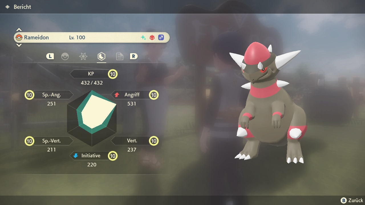 Das Pokemon ist mit beeindruckenden 6×31 IV-Werten ausgestattet. Das bedeutet, dass es auf allen sechs Werten (KP, Ang., Sp-Ang., Vert., Sp-Vert., Init.) die maximalen 31 IV/DV-Punkte besitzt. Dein Pokemon startet somit mit herausragender Stärke in digitale Kämpfe.
