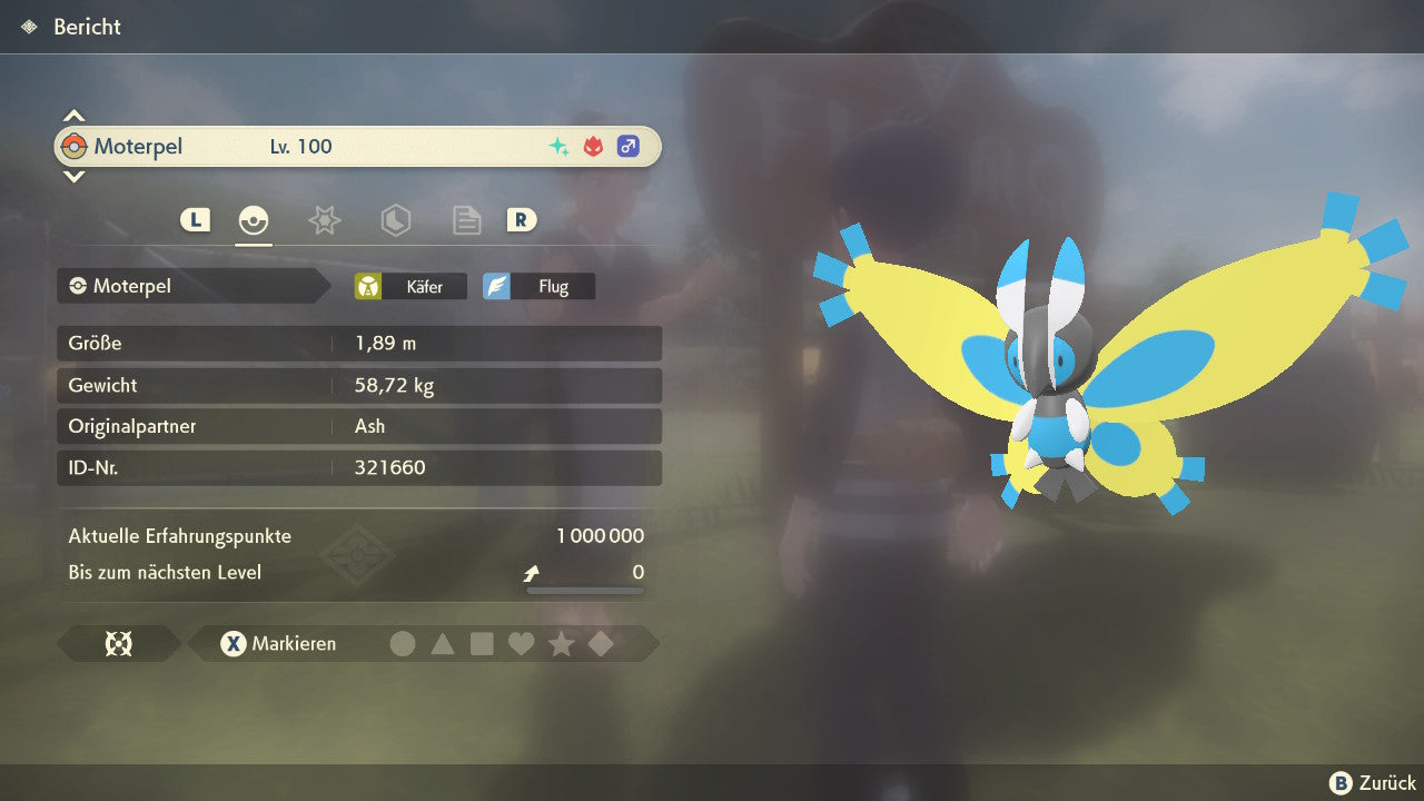 Das Pokemon ist mit beeindruckenden 6×31 IV-Werten ausgestattet. Das bedeutet, dass es auf allen sechs Werten (KP, Ang., Sp-Ang., Vert., Sp-Vert., Init.) die maximalen 31 IV/DV-Punkte besitzt. Dein Pokemon startet somit mit herausragender Stärke in digitale Kämpfe.