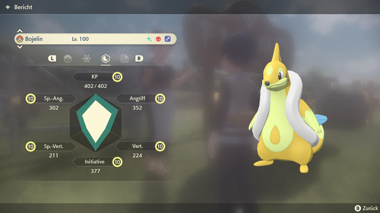 Das Pokemon ist mit beeindruckenden 6×31 IV-Werten ausgestattet. Das bedeutet, dass es auf allen sechs Werten (KP, Ang., Sp-Ang., Vert., Sp-Vert., Init.) die maximalen 31 IV/DV-Punkte besitzt. Dein Pokemon startet somit mit herausragender Stärke in digitale Kämpfe.