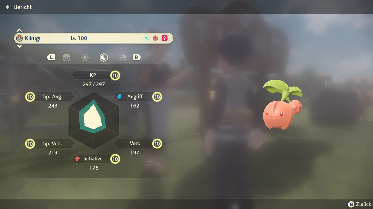 Das Pokemon ist mit beeindruckenden 6×31 IV-Werten ausgestattet. Das bedeutet, dass es auf allen sechs Werten (KP, Ang., Sp-Ang., Vert., Sp-Vert., Init.) die maximalen 31 IV/DV-Punkte besitzt. Dein Pokemon startet somit mit herausragender Stärke in digitale Kämpfe.