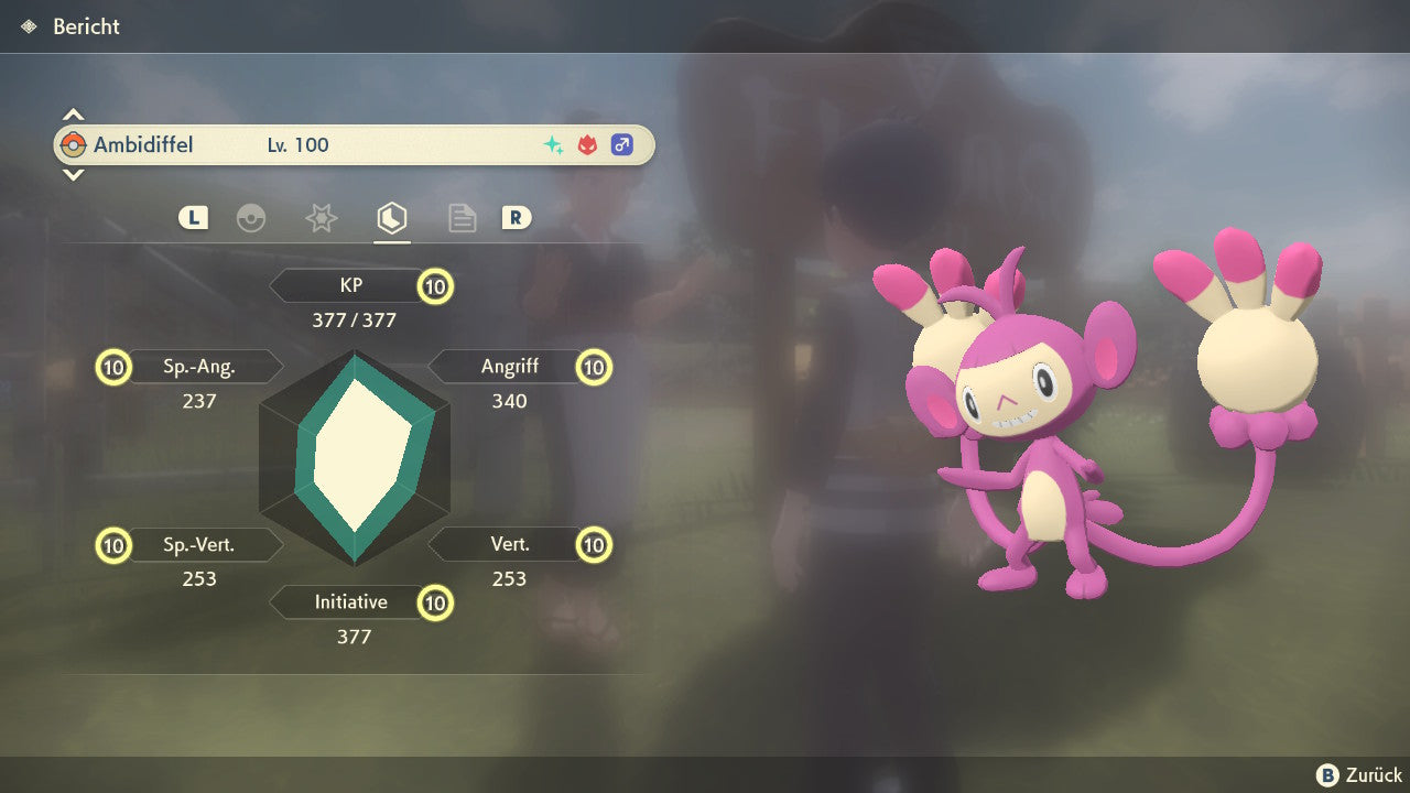 Das Pokemon ist mit beeindruckenden 6×31 IV-Werten ausgestattet. Das bedeutet, dass es auf allen sechs Werten (KP, Ang., Sp-Ang., Vert., Sp-Vert., Init.) die maximalen 31 IV/DV-Punkte besitzt. Dein Pokemon startet somit mit herausragender Stärke in digitale Kämpfe.