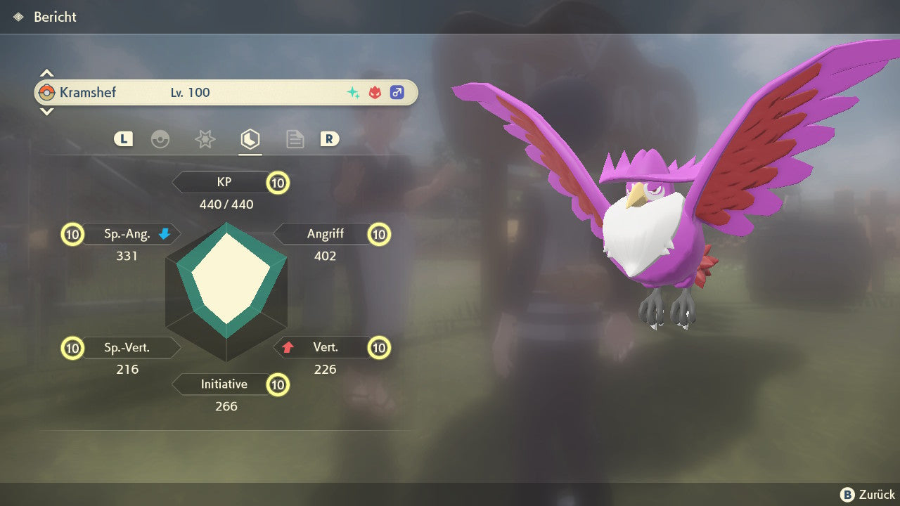 Das Pokemon ist mit beeindruckenden 6×31 IV-Werten ausgestattet. Das bedeutet, dass es auf allen sechs Werten (KP, Ang., Sp-Ang., Vert., Sp-Vert., Init.) die maximalen 31 IV/DV-Punkte besitzt. Dein Pokemon startet somit mit herausragender Stärke in digitale Kämpfe.