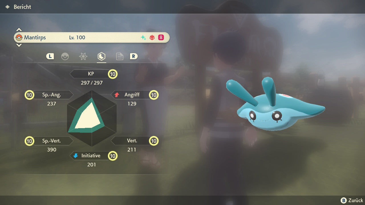 Das Pokemon ist mit beeindruckenden 6×31 IV-Werten ausgestattet. Das bedeutet, dass es auf allen sechs Werten (KP, Ang., Sp-Ang., Vert., Sp-Vert., Init.) die maximalen 31 IV/DV-Punkte besitzt. Dein Pokemon startet somit mit herausragender Stärke in digitale Kämpfe.
