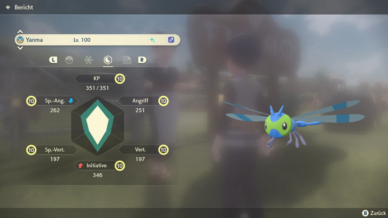 Das Pokemon ist mit beeindruckenden 6×31 IV-Werten ausgestattet. Das bedeutet, dass es auf allen sechs Werten (KP, Ang., Sp-Ang., Vert., Sp-Vert., Init.) die maximalen 31 IV/DV-Punkte besitzt. Dein Pokemon startet somit mit herausragender Stärke in digitale Kämpfe.