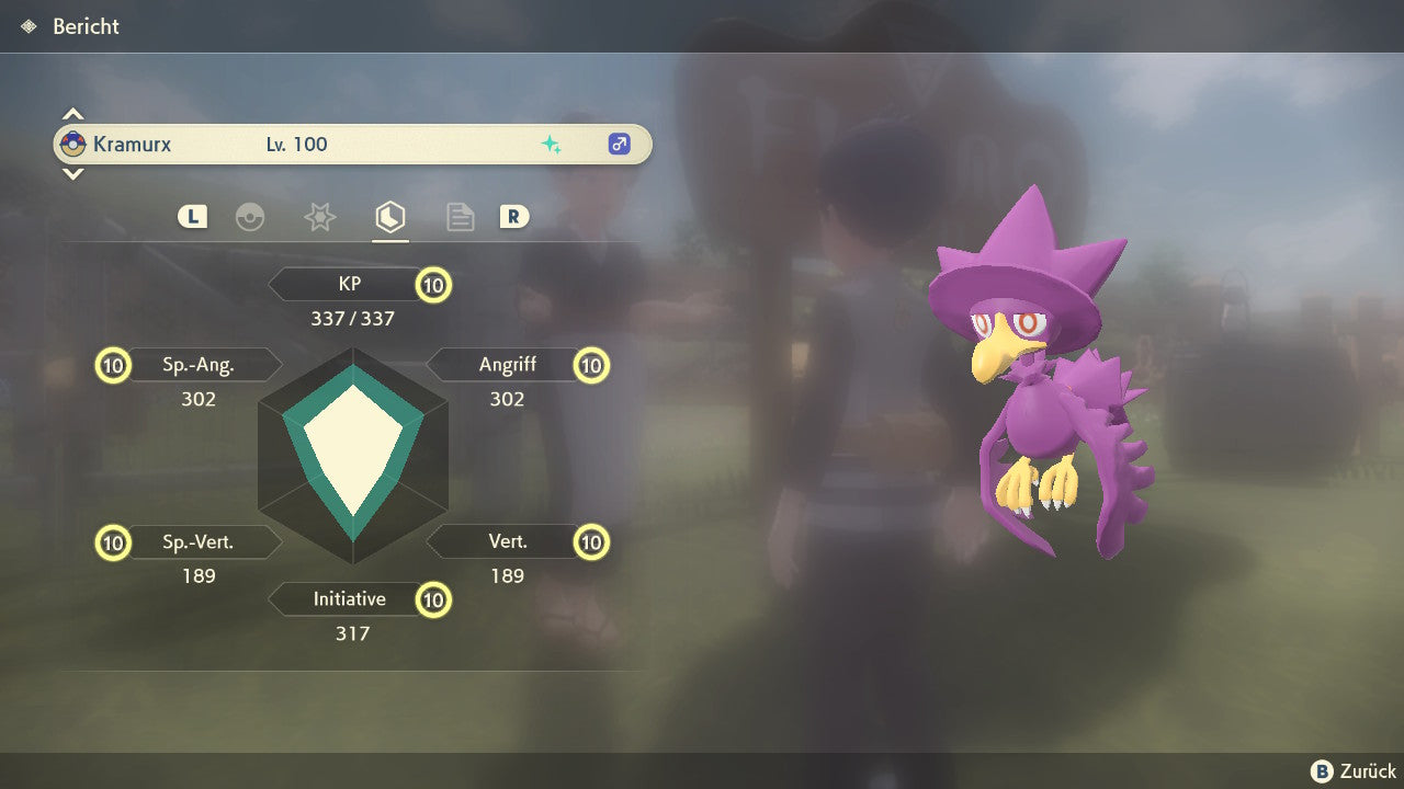 Das Pokemon ist mit beeindruckenden 6×31 IV-Werten ausgestattet. Das bedeutet, dass es auf allen sechs Werten (KP, Ang., Sp-Ang., Vert., Sp-Vert., Init.) die maximalen 31 IV/DV-Punkte besitzt. Dein Pokemon startet somit mit herausragender Stärke in digitale Kämpfe.
