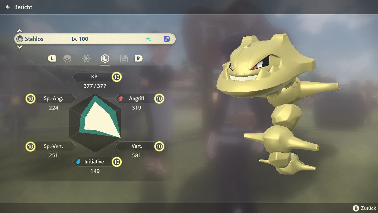 Das Pokemon ist mit beeindruckenden 6×31 IV-Werten ausgestattet. Das bedeutet, dass es auf allen sechs Werten (KP, Ang., Sp-Ang., Vert., Sp-Vert., Init.) die maximalen 31 IV/DV-Punkte besitzt. Dein Pokemon startet somit mit herausragender Stärke in digitale Kämpfe.
