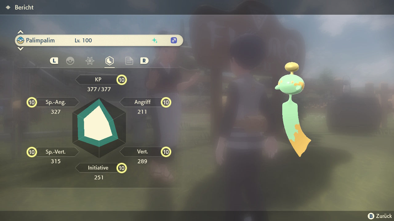 Das Pokemon ist mit beeindruckenden 6×31 IV-Werten ausgestattet. Das bedeutet, dass es auf allen sechs Werten (KP, Ang., Sp-Ang., Vert., Sp-Vert., Init.) die maximalen 31 IV/DV-Punkte besitzt. Dein Pokemon startet somit mit herausragender Stärke in digitale Kämpfe.