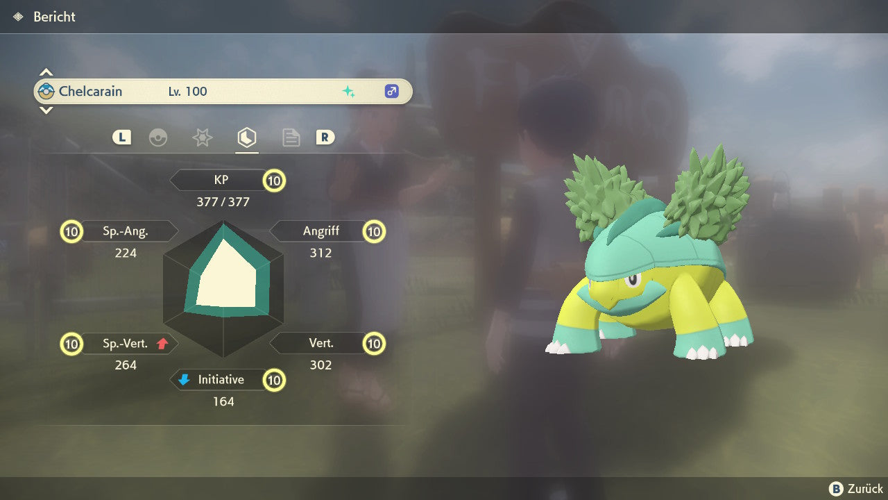 Das Pokemon ist mit beeindruckenden 6×31 IV-Werten ausgestattet. Das bedeutet, dass es auf allen sechs Werten (KP, Ang., Sp-Ang., Vert., Sp-Vert., Init.) die maximalen 31 IV/DV-Punkte besitzt. Dein Pokemon startet somit mit herausragender Stärke in digitale Kämpfe.