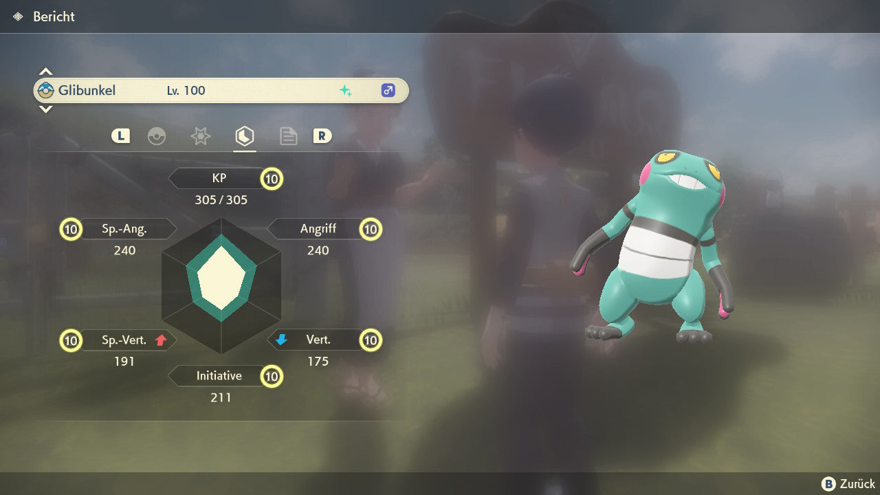 Das Pokemon ist mit beeindruckenden 6×31 IV-Werten ausgestattet. Das bedeutet, dass es auf allen sechs Werten (KP, Ang., Sp-Ang., Vert., Sp-Vert., Init.) die maximalen 31 IV/DV-Punkte besitzt. Dein Pokemon startet somit mit herausragender Stärke in digitale Kämpfe.