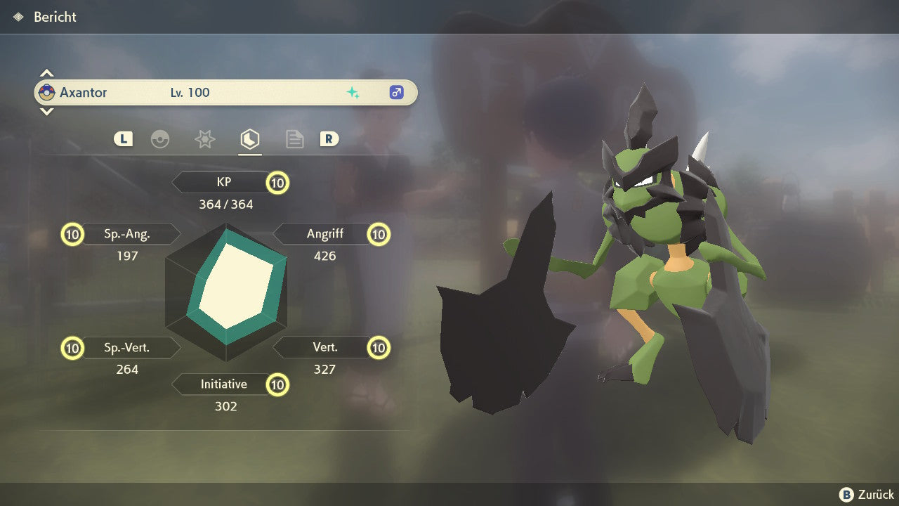 Das Pokemon ist mit beeindruckenden 6×31 IV-Werten ausgestattet. Das bedeutet, dass es auf allen sechs Werten (KP, Ang., Sp-Ang., Vert., Sp-Vert., Init.) die maximalen 31 IV/DV-Punkte besitzt. Dein Pokemon startet somit mit herausragender Stärke in digitale Kämpfe.