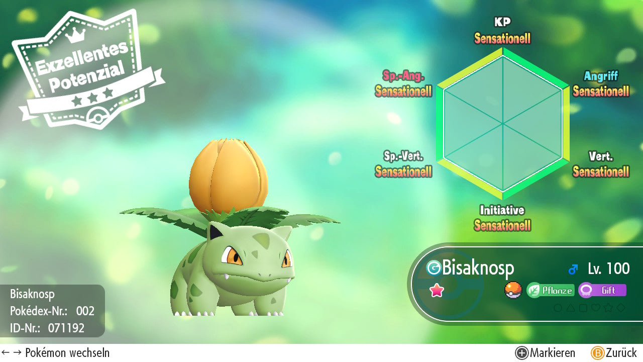 Das Pokemon ist mit beeindruckenden 6×31 IV-Werten ausgestattet. Das bedeutet, dass es auf allen sechs Werten (KP, Ang., Sp-Ang., Vert., Sp-Vert., Init.) die maximalen 31 IV/DV-Punkte besitzt. Dein Pokemon startet somit mit herausragender Stärke in digitale Kämpfe.