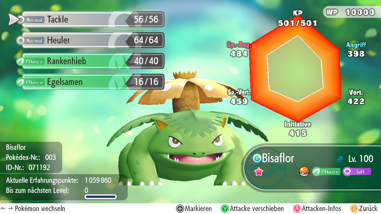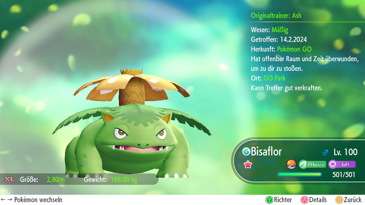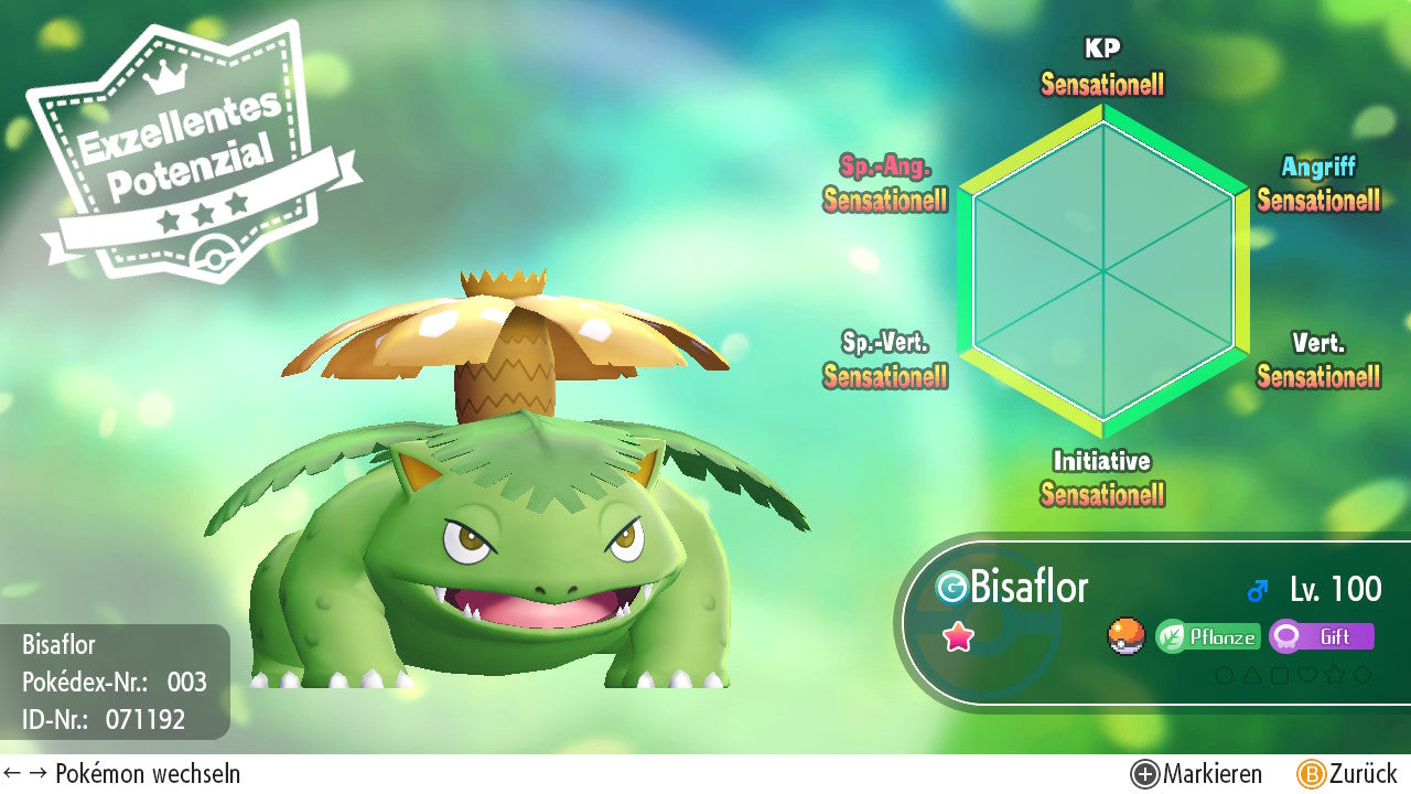 Das Pokemon ist mit beeindruckenden 6×31 IV-Werten ausgestattet. Das bedeutet, dass es auf allen sechs Werten (KP, Ang., Sp-Ang., Vert., Sp-Vert., Init.) die maximalen 31 IV/DV-Punkte besitzt. Dein Pokemon startet somit mit herausragender Stärke in digitale Kämpfe.