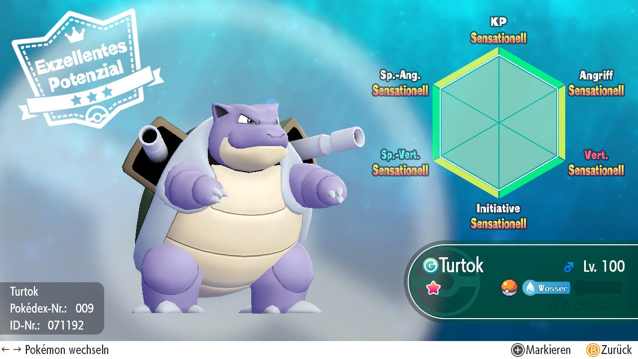 Das Pokemon ist mit beeindruckenden 6×31 IV-Werten ausgestattet. Das bedeutet, dass es auf allen sechs Werten (KP, Ang., Sp-Ang., Vert., Sp-Vert., Init.) die maximalen 31 IV/DV-Punkte besitzt. Dein Pokemon startet somit mit herausragender Stärke in digitale Kämpfe.