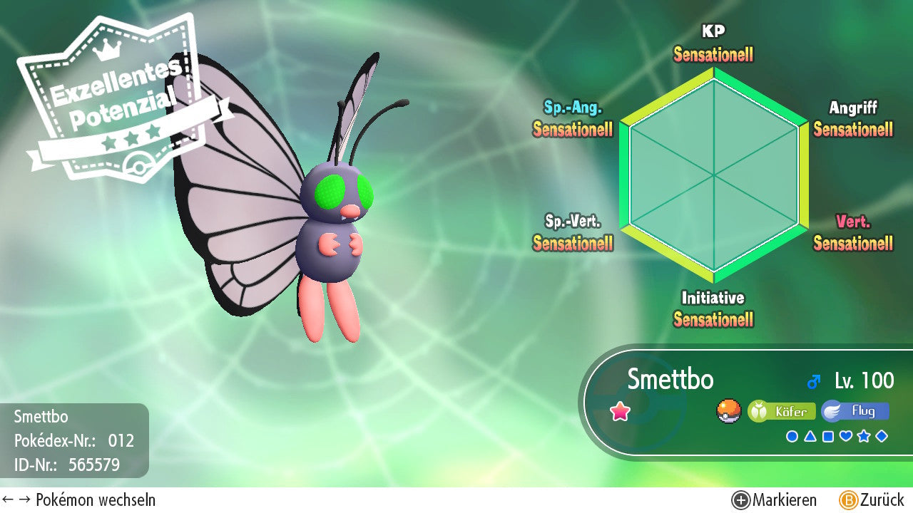 Das Pokemon ist mit beeindruckenden 6×31 IV-Werten ausgestattet. Das bedeutet, dass es auf allen sechs Werten (KP, Ang., Sp-Ang., Vert., Sp-Vert., Init.) die maximalen 31 IV/DV-Punkte besitzt. Dein Pokemon startet somit mit herausragender Stärke in digitale Kämpfe.