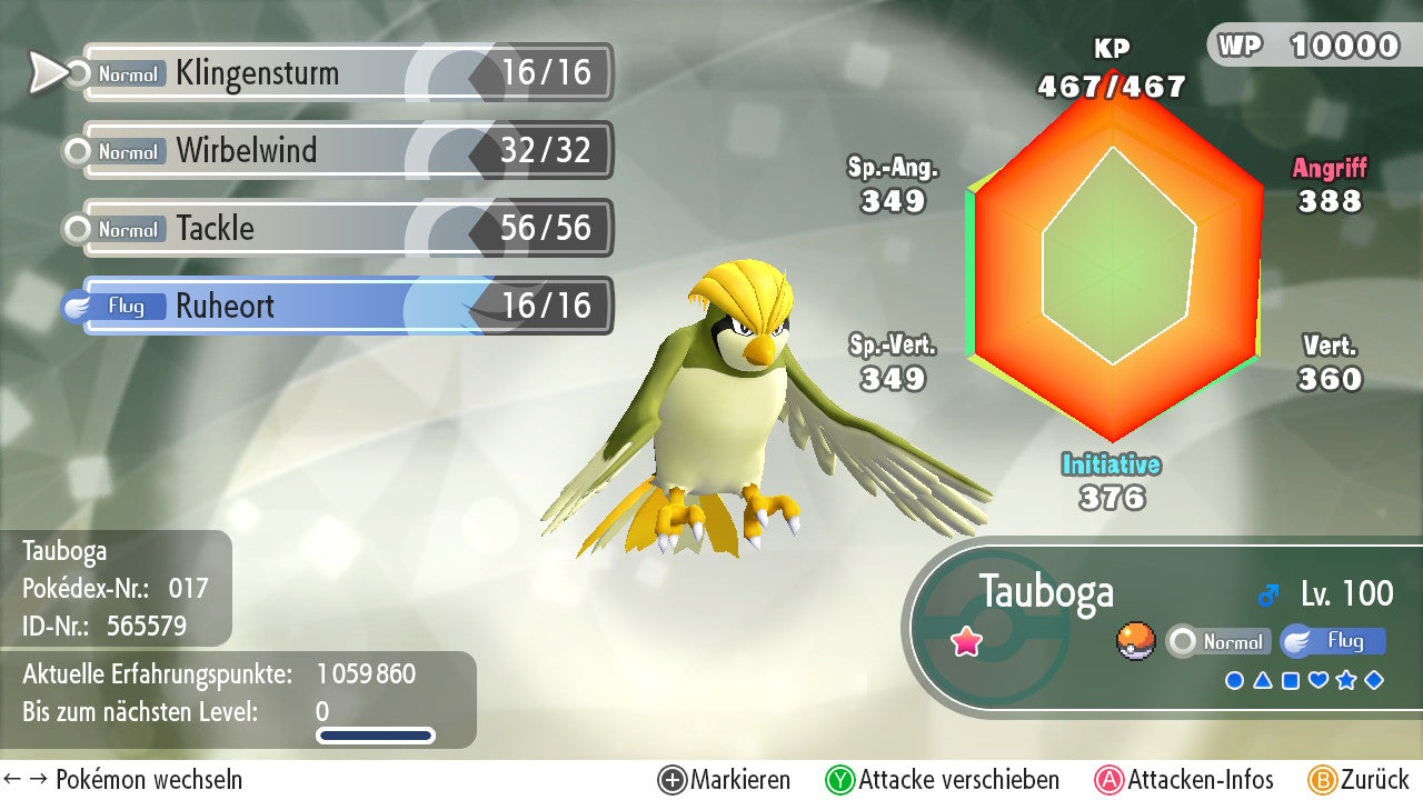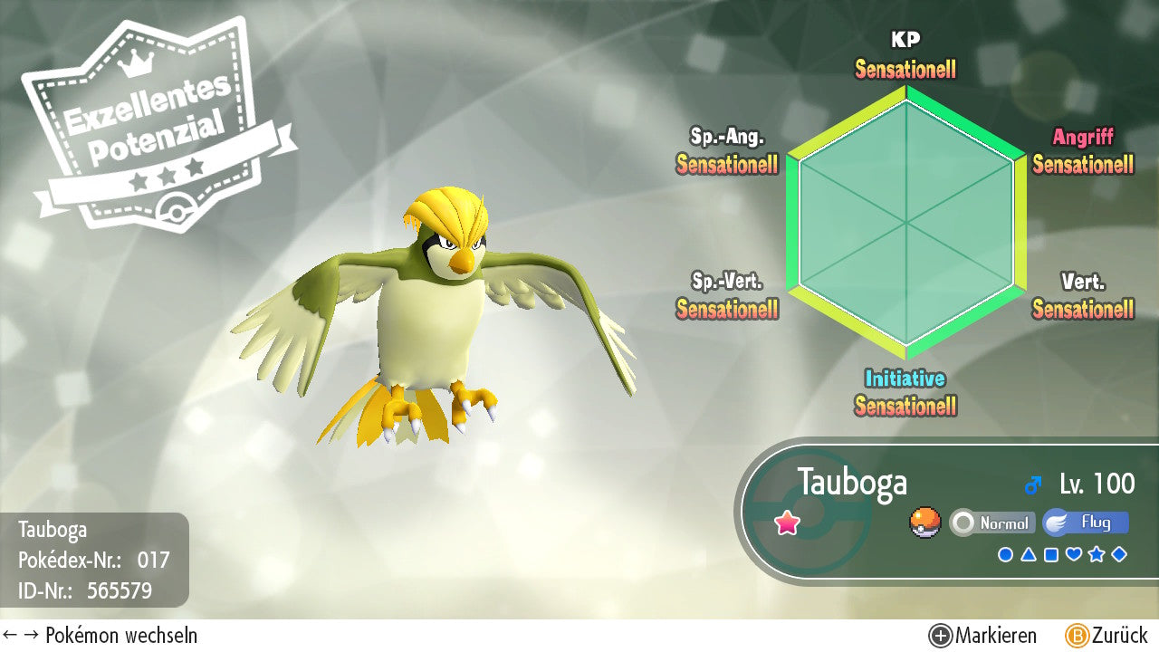 Das Pokemon ist mit beeindruckenden 6×31 IV-Werten ausgestattet. Das bedeutet, dass es auf allen sechs Werten (KP, Ang., Sp-Ang., Vert., Sp-Vert., Init.) die maximalen 31 IV/DV-Punkte besitzt. Dein Pokemon startet somit mit herausragender Stärke in digitale Kämpfe.