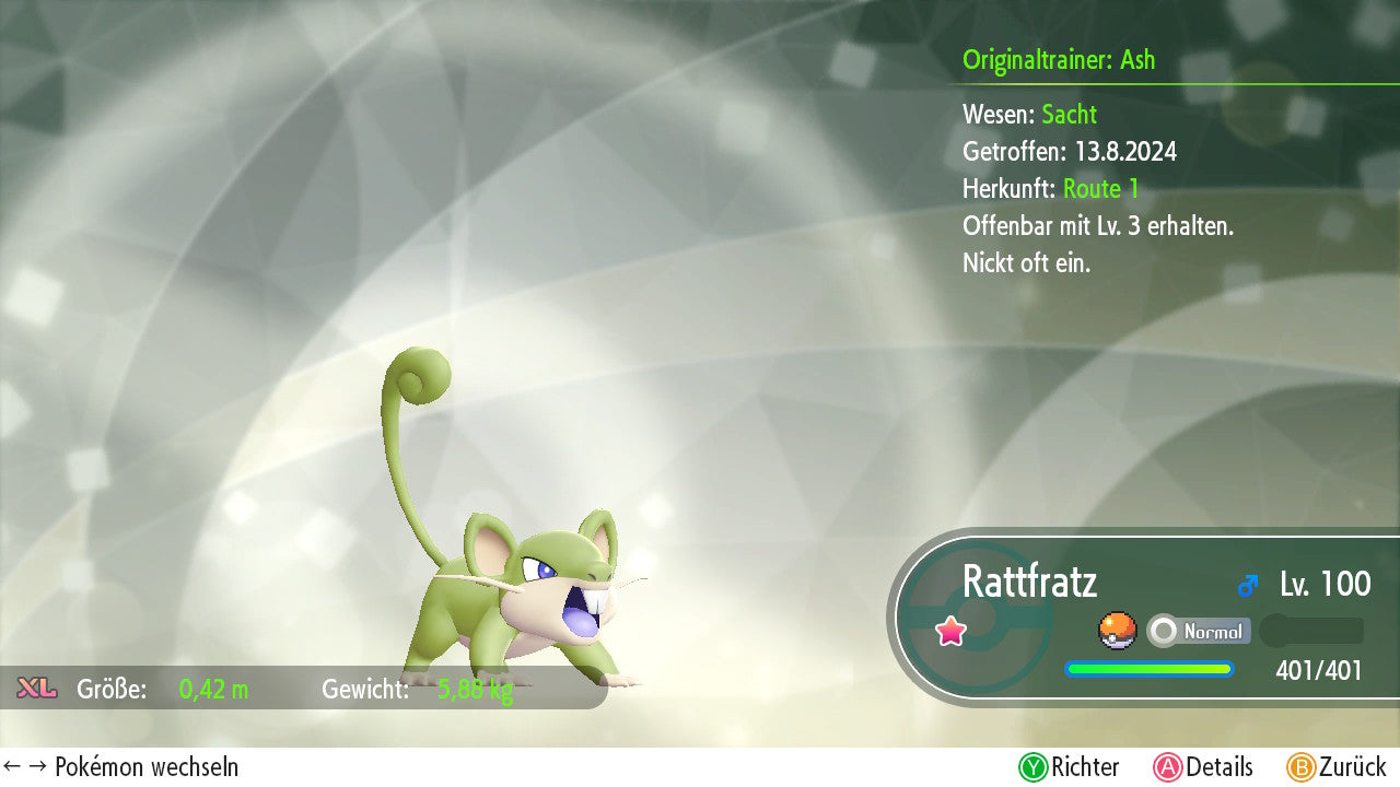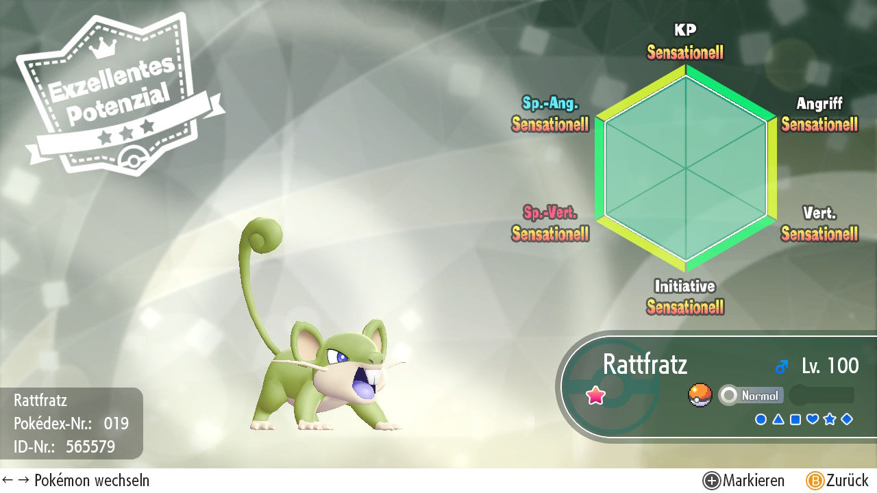 Das Pokemon ist mit beeindruckenden 6×31 IV-Werten ausgestattet. Das bedeutet, dass es auf allen sechs Werten (KP, Ang., Sp-Ang., Vert., Sp-Vert., Init.) die maximalen 31 IV/DV-Punkte besitzt. Dein Pokemon startet somit mit herausragender Stärke in digitale Kämpfe.