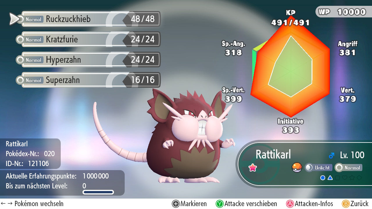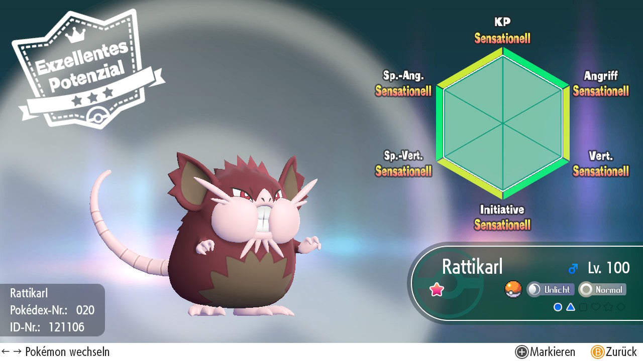 Das Pokemon ist mit beeindruckenden 6×31 IV-Werten ausgestattet. Das bedeutet, dass es auf allen sechs Werten (KP, Ang., Sp-Ang., Vert., Sp-Vert., Init.) die maximalen 31 IV/DV-Punkte besitzt. Dein Pokemon startet somit mit herausragender Stärke in digitale Kämpfe.