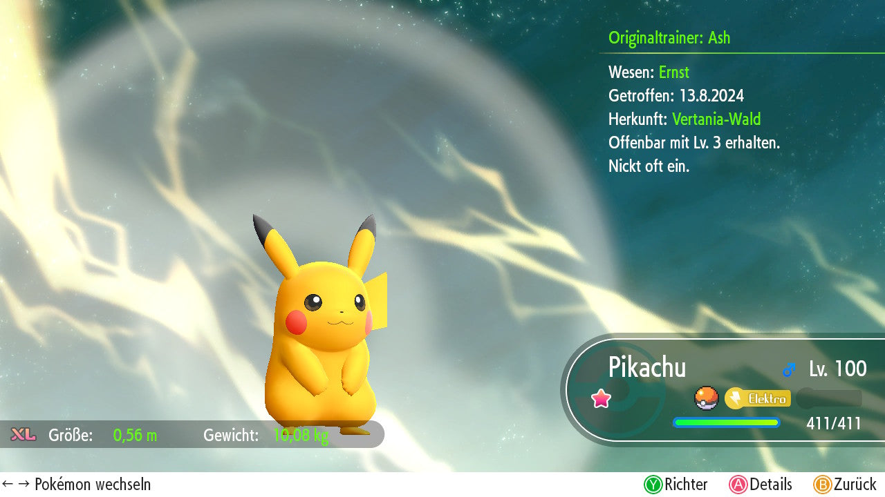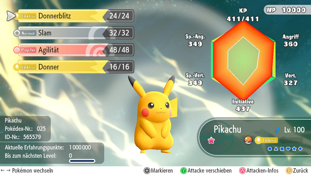 Das Pokemon ist mit beeindruckenden 6×31 IV-Werten ausgestattet. Das bedeutet, dass es auf allen sechs Werten (KP, Ang., Sp-Ang., Vert., Sp-Vert., Init.) die maximalen 31 IV/DV-Punkte besitzt. Dein Pokemon startet somit mit herausragender Stärke in digitale Kämpfe.