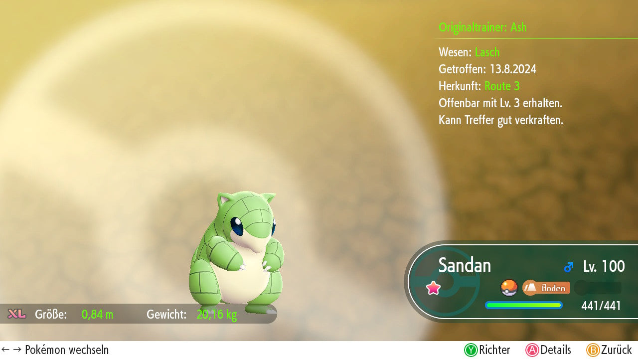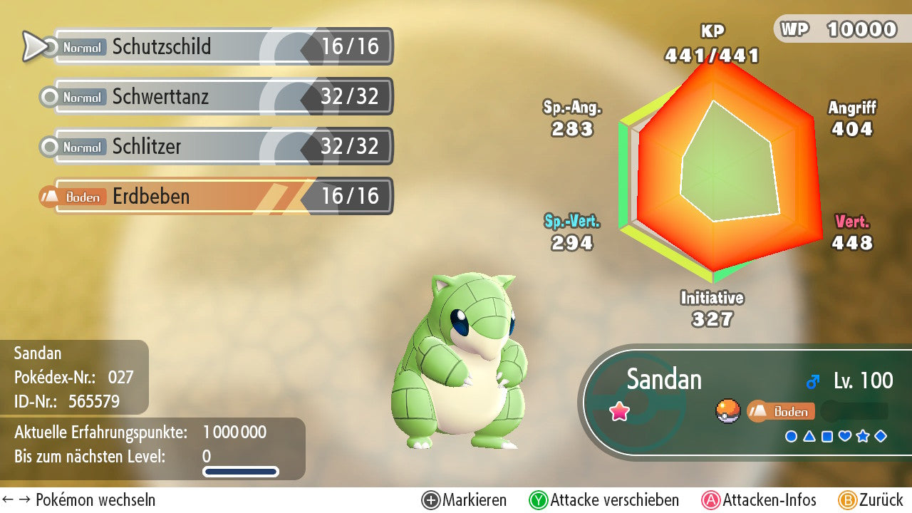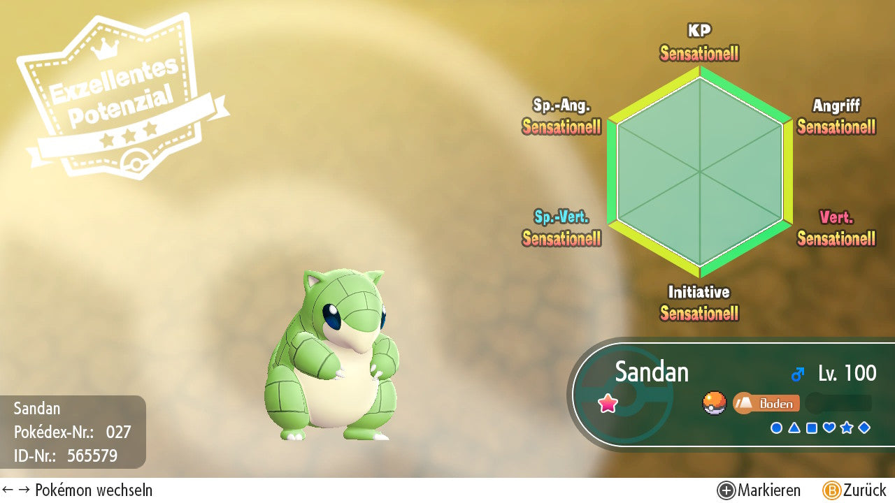 Das Pokemon ist mit beeindruckenden 6×31 IV-Werten ausgestattet. Das bedeutet, dass es auf allen sechs Werten (KP, Ang., Sp-Ang., Vert., Sp-Vert., Init.) die maximalen 31 IV/DV-Punkte besitzt. Dein Pokemon startet somit mit herausragender Stärke in digitale Kämpfe.