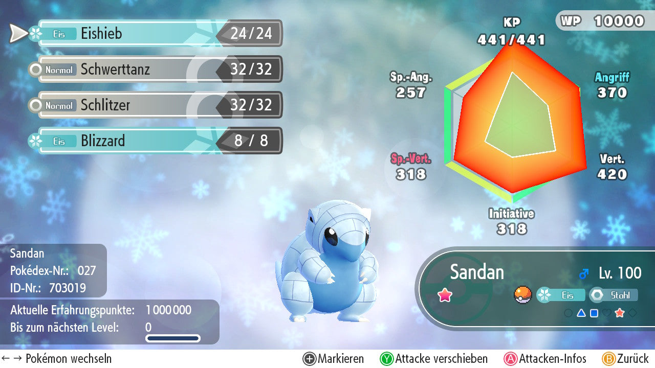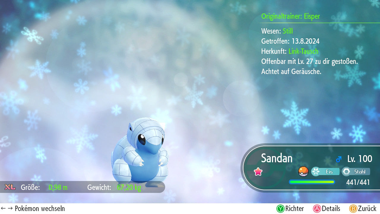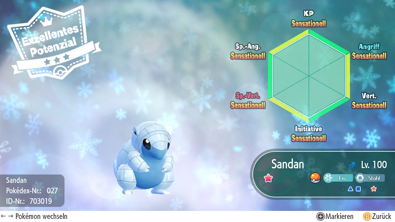 Das Pokemon ist mit beeindruckenden 6×31 IV-Werten ausgestattet. Das bedeutet, dass es auf allen sechs Werten (KP, Ang., Sp-Ang., Vert., Sp-Vert., Init.) die maximalen 31 IV/DV-Punkte besitzt. Dein Pokemon startet somit mit herausragender Stärke in digitale Kämpfe.
