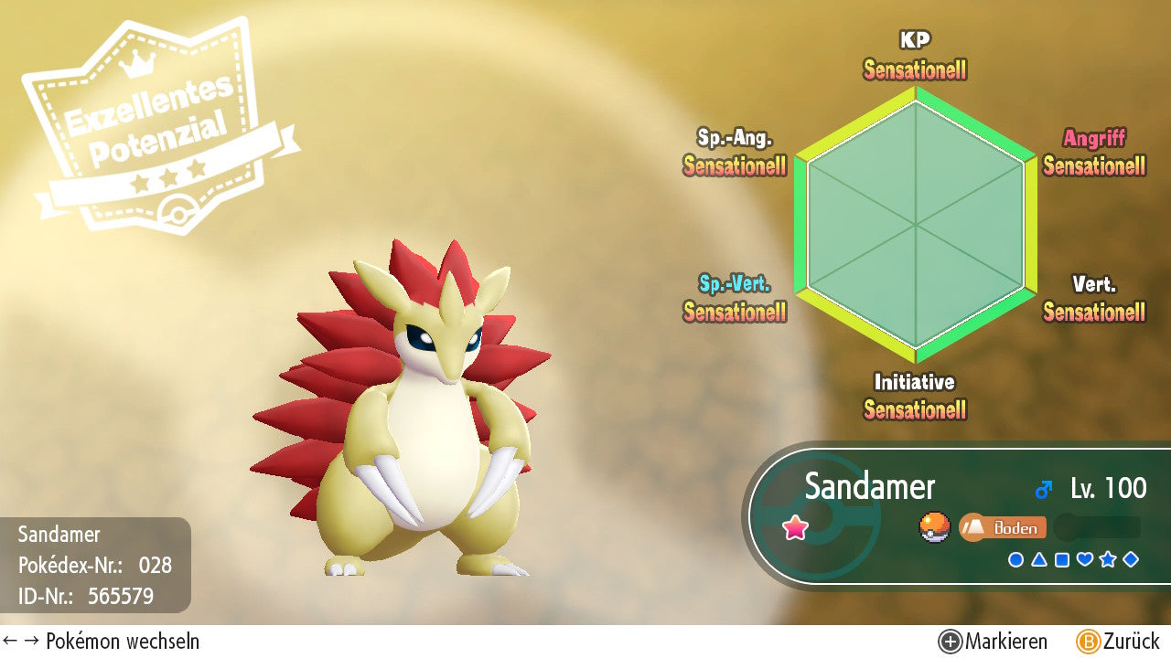 Das Pokemon ist mit beeindruckenden 6×31 IV-Werten ausgestattet. Das bedeutet, dass es auf allen sechs Werten (KP, Ang., Sp-Ang., Vert., Sp-Vert., Init.) die maximalen 31 IV/DV-Punkte besitzt. Dein Pokemon startet somit mit herausragender Stärke in digitale Kämpfe.