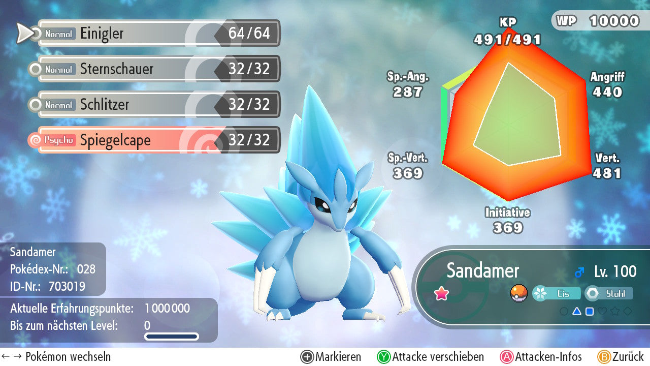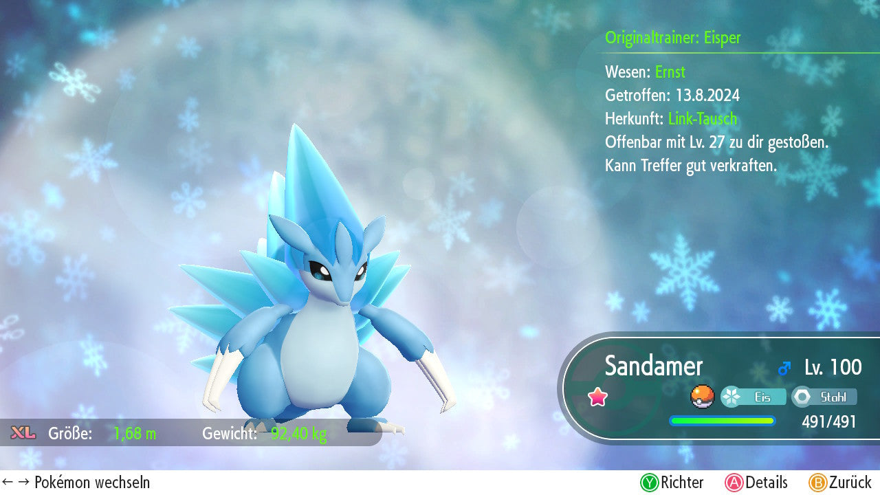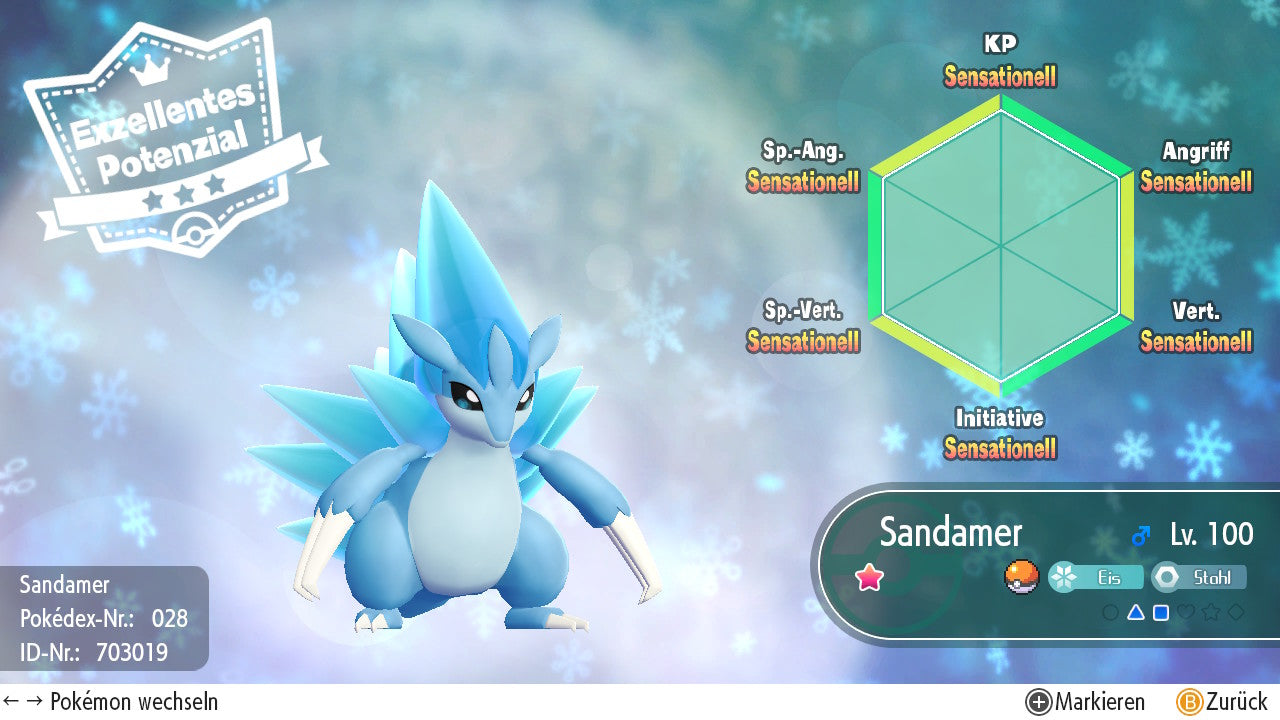 Das Pokemon ist mit beeindruckenden 6×31 IV-Werten ausgestattet. Das bedeutet, dass es auf allen sechs Werten (KP, Ang., Sp-Ang., Vert., Sp-Vert., Init.) die maximalen 31 IV/DV-Punkte besitzt. Dein Pokemon startet somit mit herausragender Stärke in digitale Kämpfe.