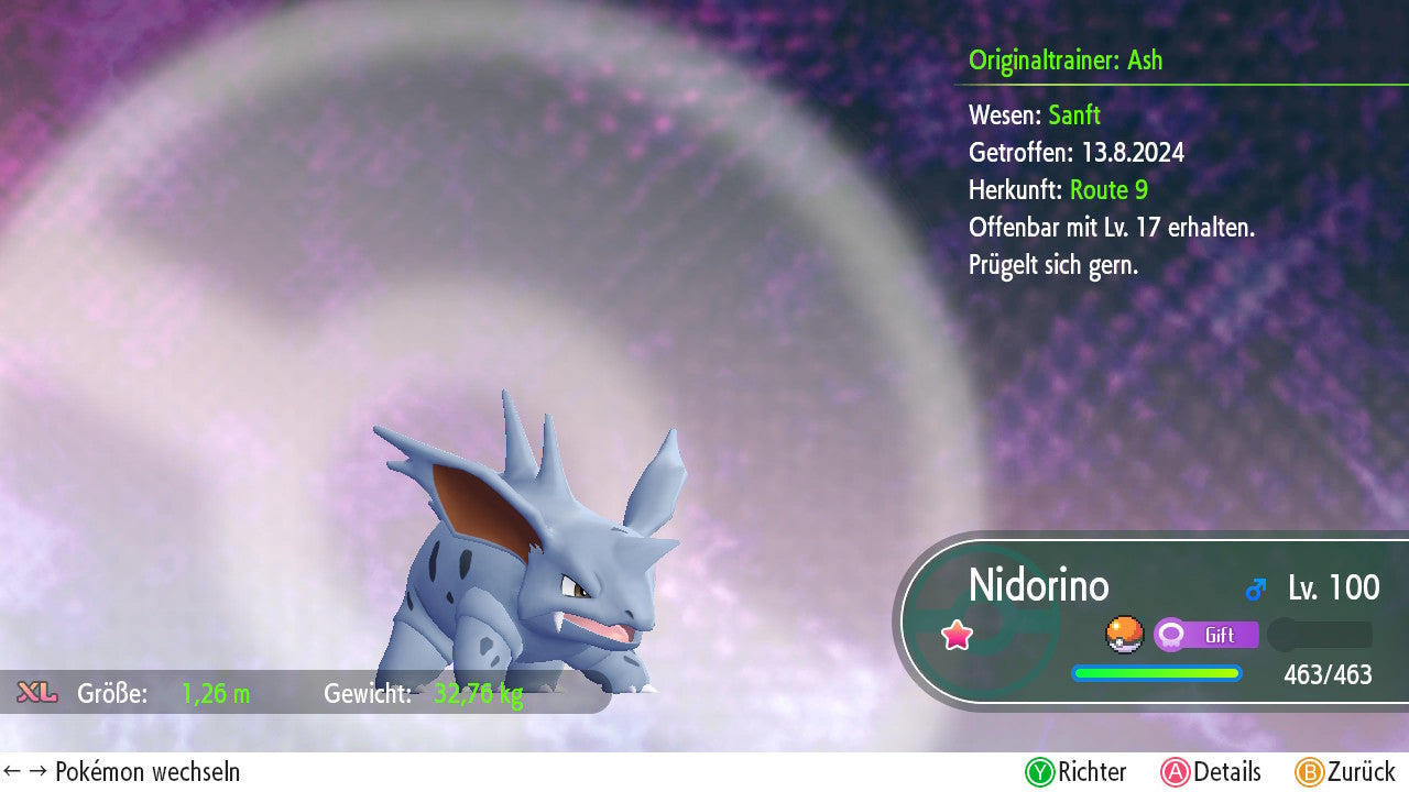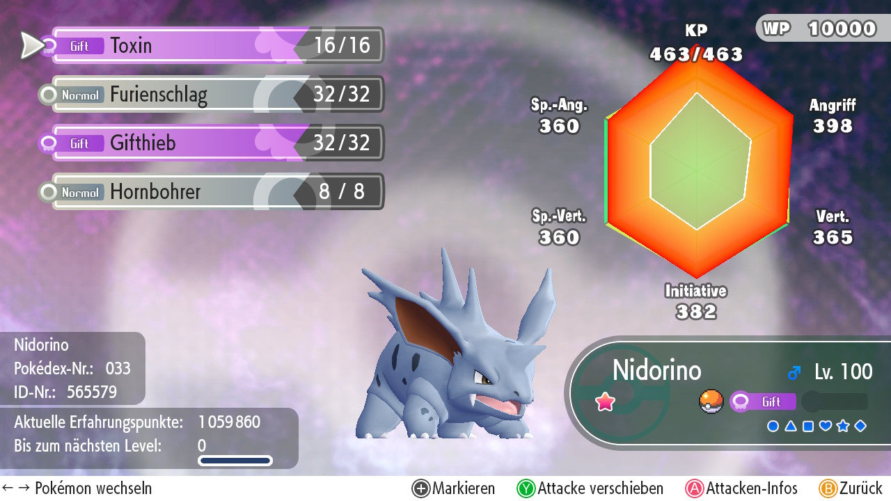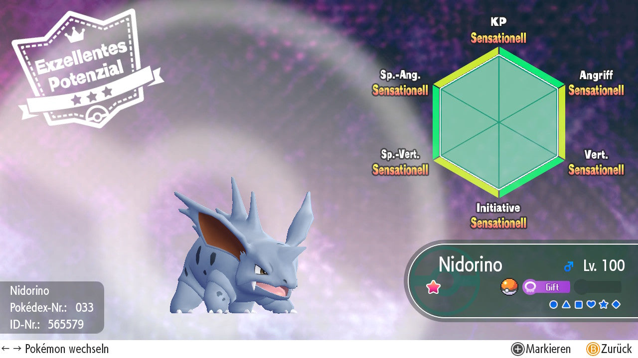 Das Pokemon ist mit beeindruckenden 6×31 IV-Werten ausgestattet. Das bedeutet, dass es auf allen sechs Werten (KP, Ang., Sp-Ang., Vert., Sp-Vert., Init.) die maximalen 31 IV/DV-Punkte besitzt. Dein Pokemon startet somit mit herausragender Stärke in digitale Kämpfe.