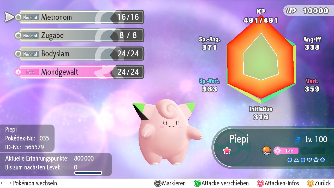 Das Pokemon ist mit beeindruckenden 6×31 IV-Werten ausgestattet. Das bedeutet, dass es auf allen sechs Werten (KP, Ang., Sp-Ang., Vert., Sp-Vert., Init.) die maximalen 31 IV/DV-Punkte besitzt. Dein Pokemon startet somit mit herausragender Stärke in digitale Kämpfe.