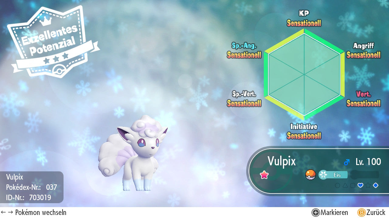 Das Pokemon ist mit beeindruckenden 6×31 IV-Werten ausgestattet. Das bedeutet, dass es auf allen sechs Werten (KP, Ang., Sp-Ang., Vert., Sp-Vert., Init.) die maximalen 31 IV/DV-Punkte besitzt. Dein Pokemon startet somit mit herausragender Stärke in digitale Kämpfe.
