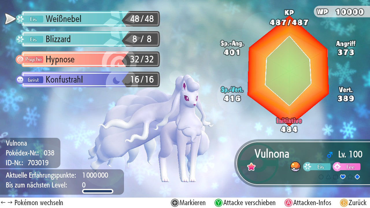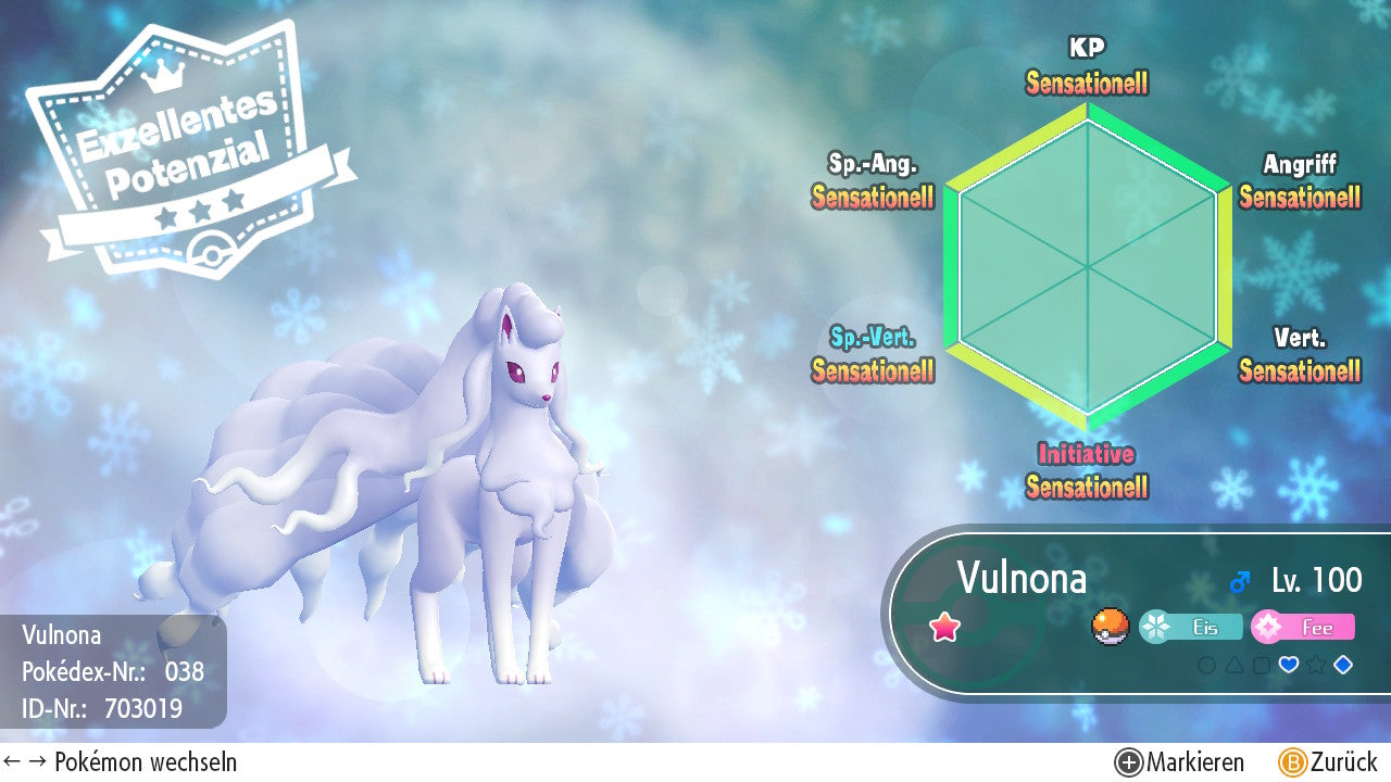 Das Pokemon ist mit beeindruckenden 6×31 IV-Werten ausgestattet. Das bedeutet, dass es auf allen sechs Werten (KP, Ang., Sp-Ang., Vert., Sp-Vert., Init.) die maximalen 31 IV/DV-Punkte besitzt. Dein Pokemon startet somit mit herausragender Stärke in digitale Kämpfe.