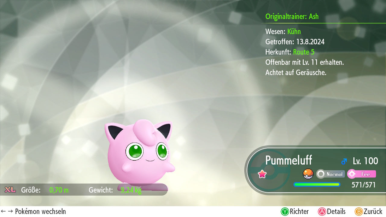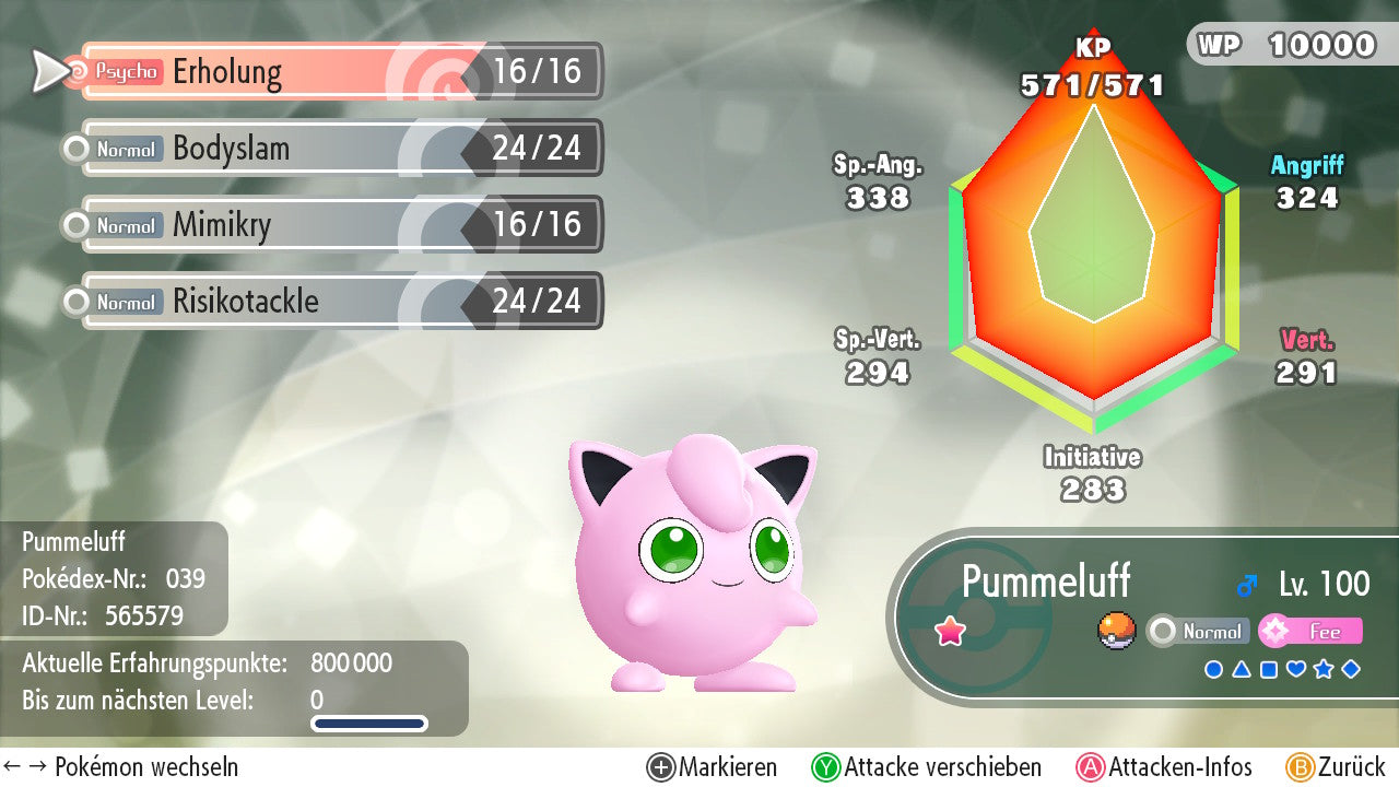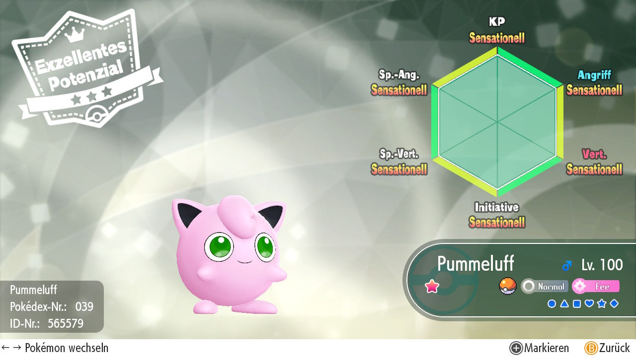 Das Pokemon ist mit beeindruckenden 6×31 IV-Werten ausgestattet. Das bedeutet, dass es auf allen sechs Werten (KP, Ang., Sp-Ang., Vert., Sp-Vert., Init.) die maximalen 31 IV/DV-Punkte besitzt. Dein Pokemon startet somit mit herausragender Stärke in digitale Kämpfe.
