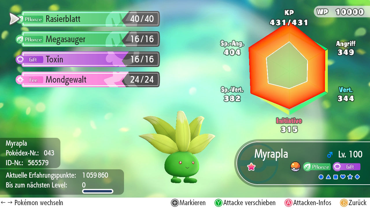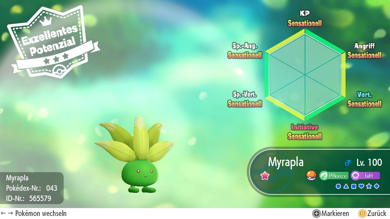 Das Pokemon ist mit beeindruckenden 6×31 IV-Werten ausgestattet. Das bedeutet, dass es auf allen sechs Werten (KP, Ang., Sp-Ang., Vert., Sp-Vert., Init.) die maximalen 31 IV/DV-Punkte besitzt. Dein Pokemon startet somit mit herausragender Stärke in digitale Kämpfe.