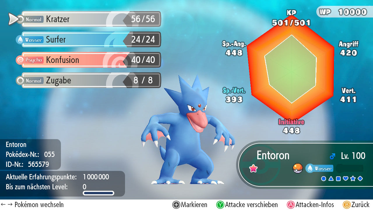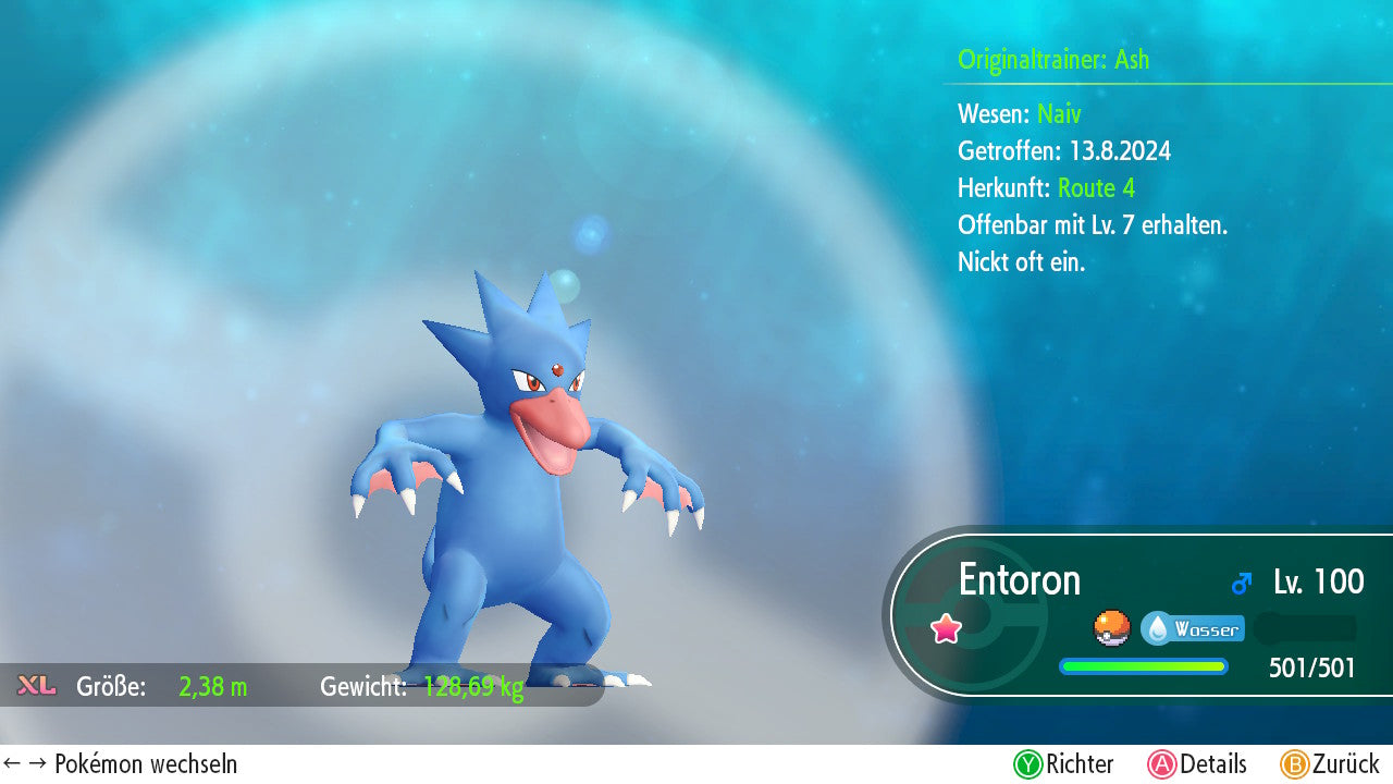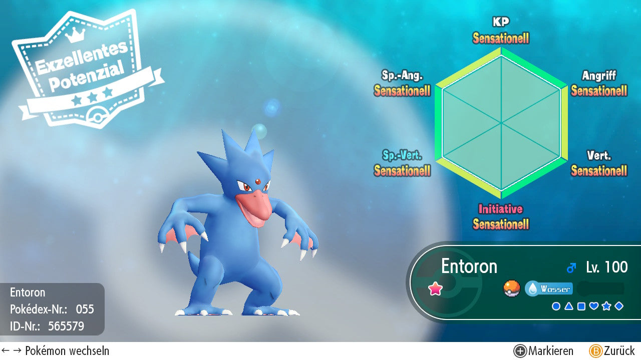 Das Pokemon ist mit beeindruckenden 6×31 IV-Werten ausgestattet. Das bedeutet, dass es auf allen sechs Werten (KP, Ang., Sp-Ang., Vert., Sp-Vert., Init.) die maximalen 31 IV/DV-Punkte besitzt. Dein Pokemon startet somit mit herausragender Stärke in digitale Kämpfe.