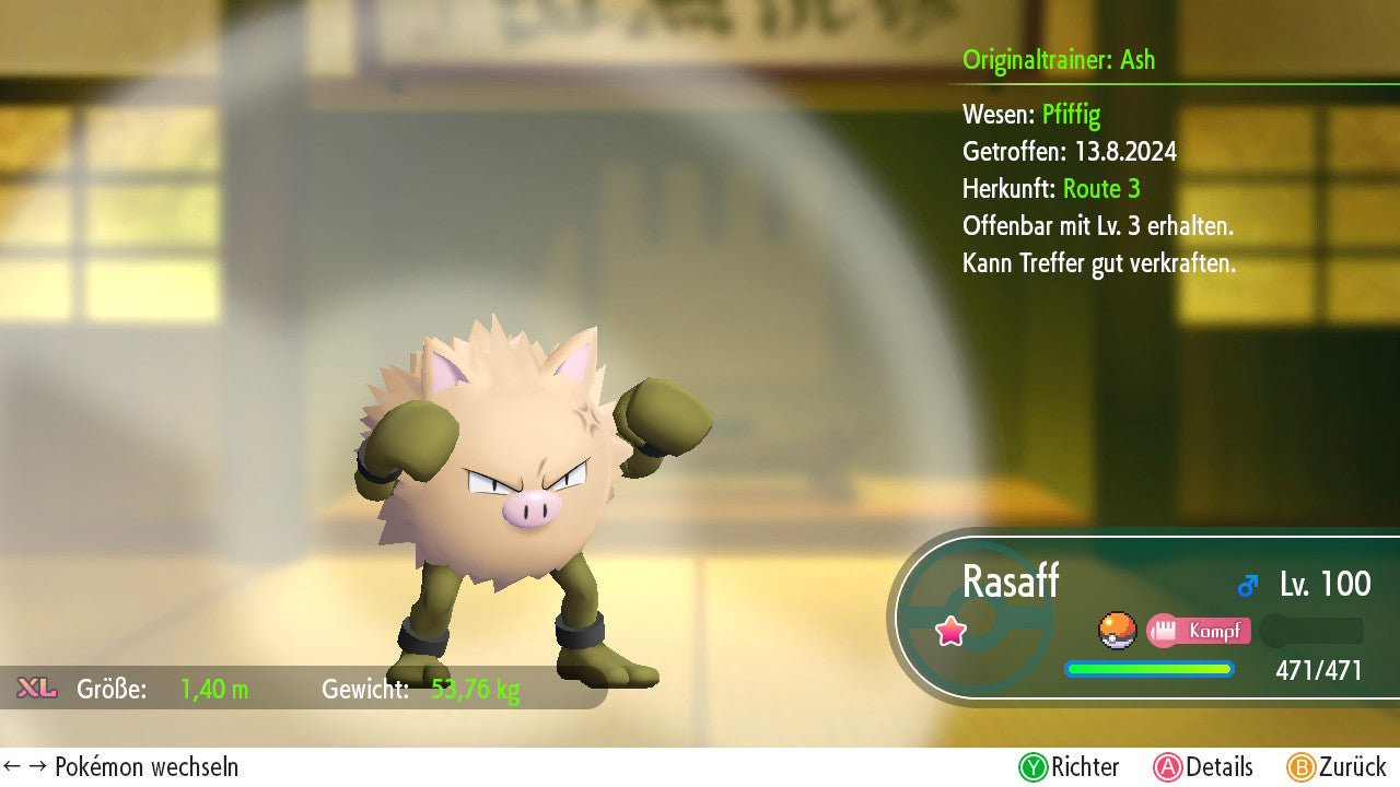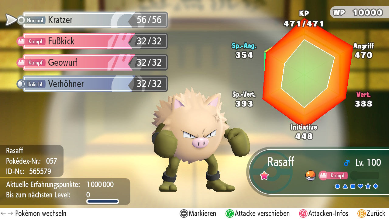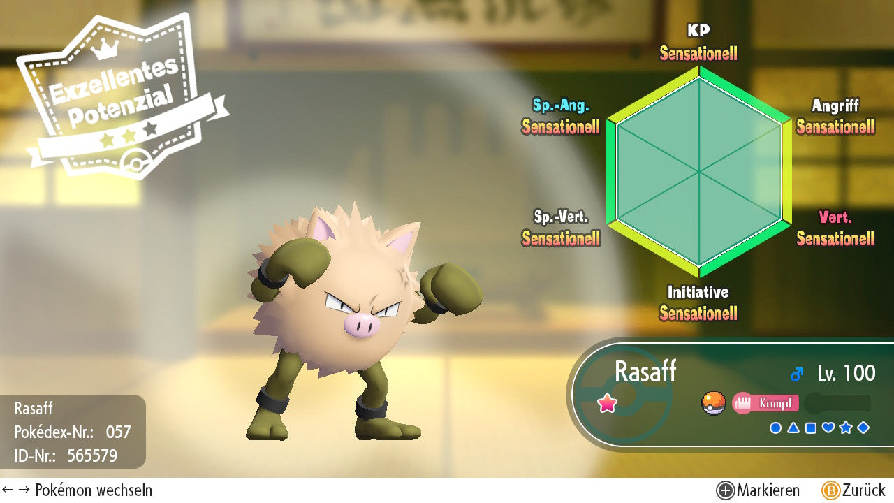 Das Pokemon ist mit beeindruckenden 6×31 IV-Werten ausgestattet. Das bedeutet, dass es auf allen sechs Werten (KP, Ang., Sp-Ang., Vert., Sp-Vert., Init.) die maximalen 31 IV/DV-Punkte besitzt. Dein Pokemon startet somit mit herausragender Stärke in digitale Kämpfe.