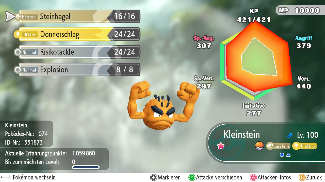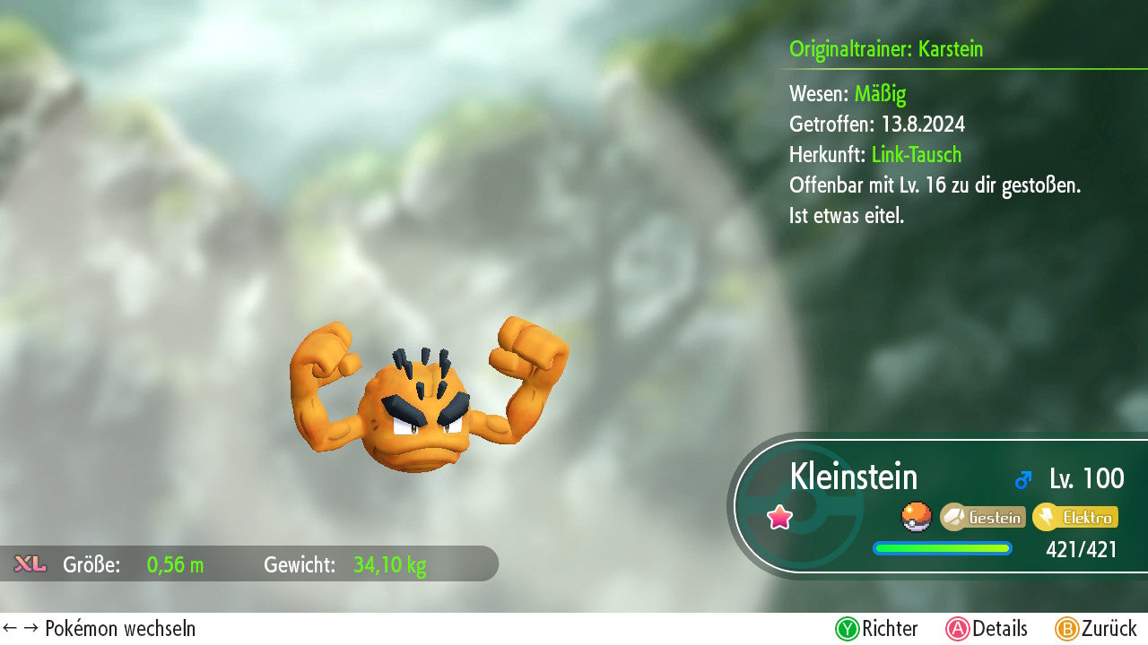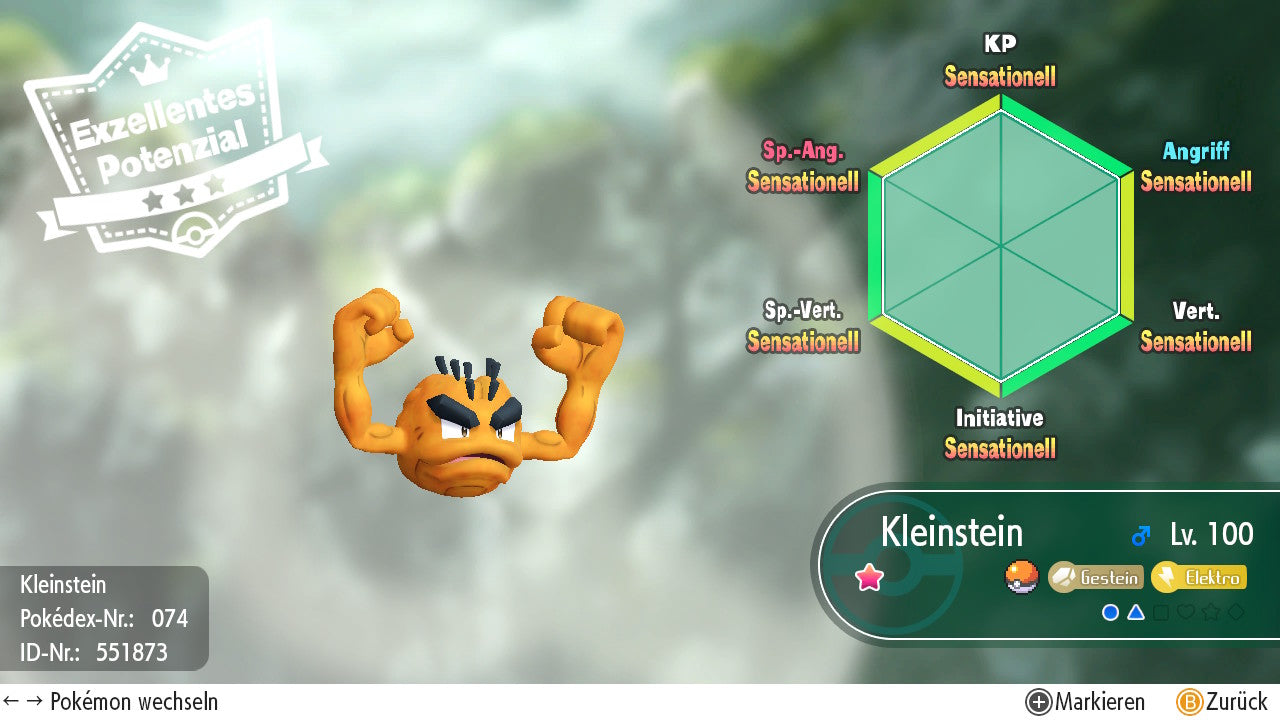 Das Pokemon ist mit beeindruckenden 6×31 IV-Werten ausgestattet. Das bedeutet, dass es auf allen sechs Werten (KP, Ang., Sp-Ang., Vert., Sp-Vert., Init.) die maximalen 31 IV/DV-Punkte besitzt. Dein Pokemon startet somit mit herausragender Stärke in digitale Kämpfe.