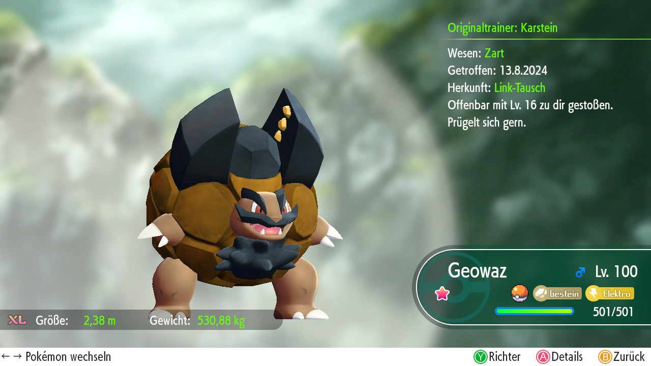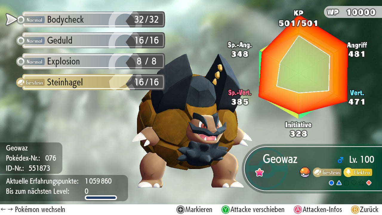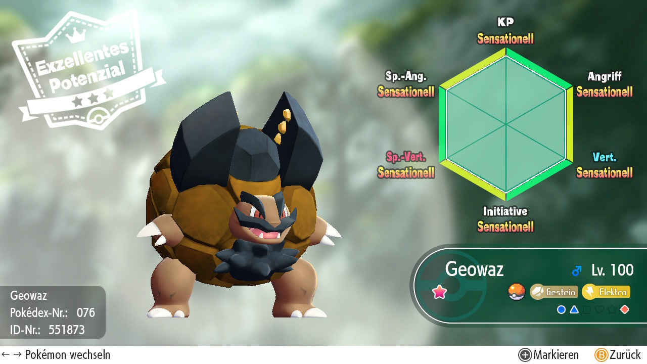 Das Pokemon ist mit beeindruckenden 6×31 IV-Werten ausgestattet. Das bedeutet, dass es auf allen sechs Werten (KP, Ang., Sp-Ang., Vert., Sp-Vert., Init.) die maximalen 31 IV/DV-Punkte besitzt. Dein Pokemon startet somit mit herausragender Stärke in digitale Kämpfe.