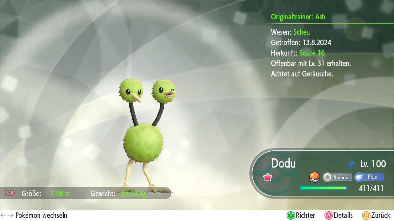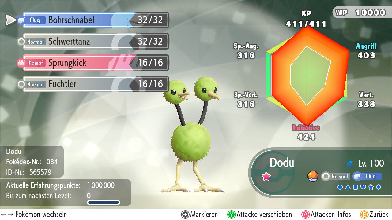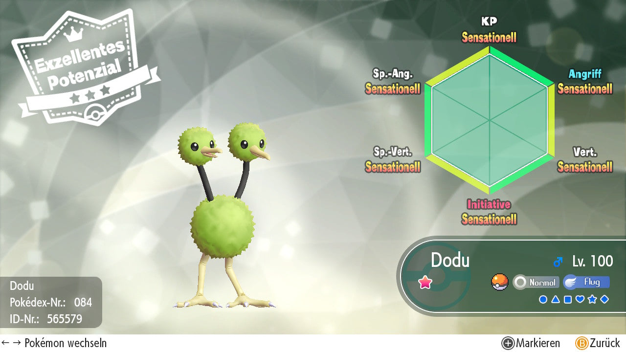 Das Pokemon ist mit beeindruckenden 6×31 IV-Werten ausgestattet. Das bedeutet, dass es auf allen sechs Werten (KP, Ang., Sp-Ang., Vert., Sp-Vert., Init.) die maximalen 31 IV/DV-Punkte besitzt. Dein Pokemon startet somit mit herausragender Stärke in digitale Kämpfe.
