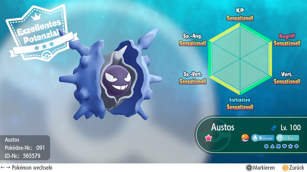 Das Pokemon ist mit beeindruckenden 6×31 IV-Werten ausgestattet. Das bedeutet, dass es auf allen sechs Werten (KP, Ang., Sp-Ang., Vert., Sp-Vert., Init.) die maximalen 31 IV/DV-Punkte besitzt. Dein Pokemon startet somit mit herausragender Stärke in digitale Kämpfe.