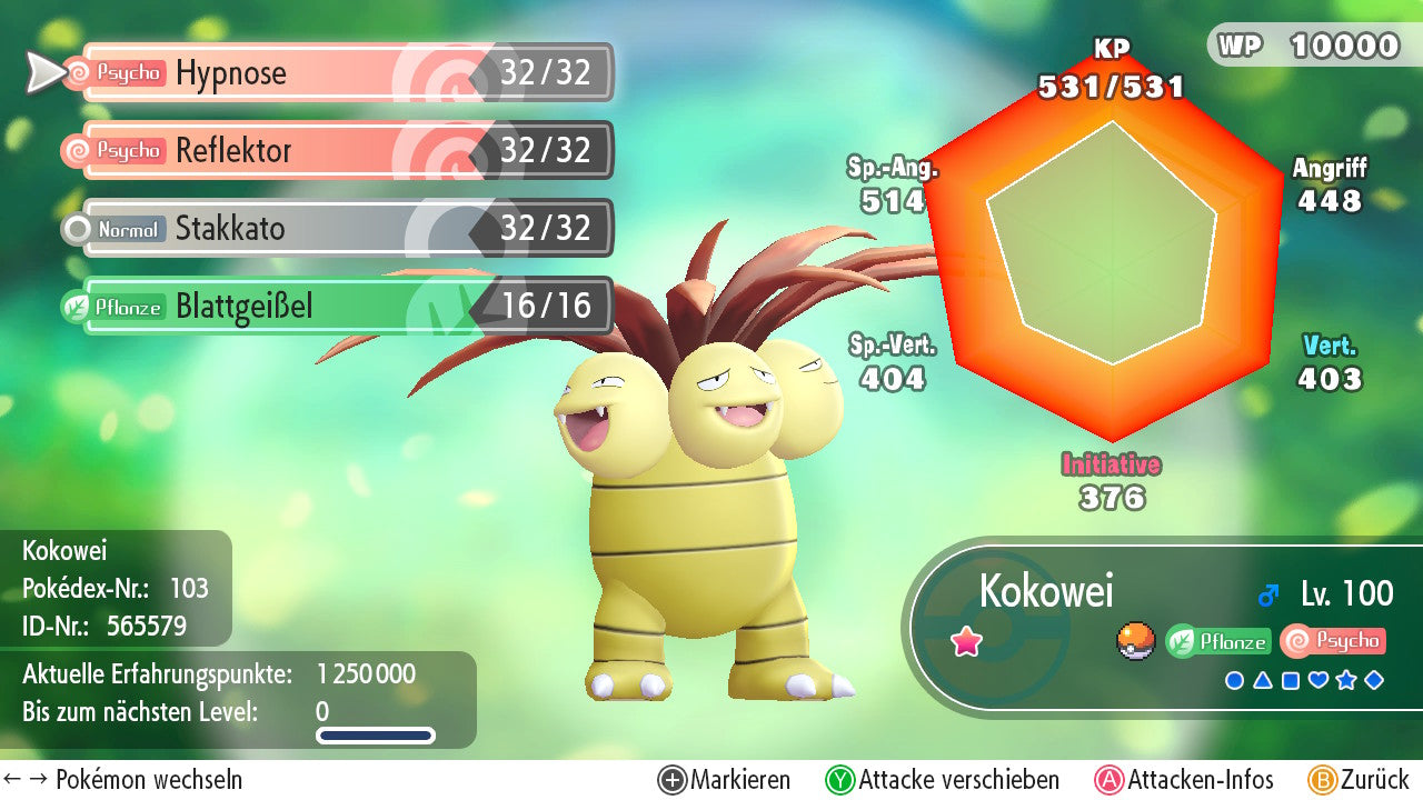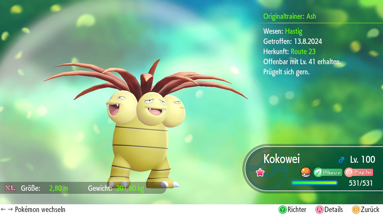 Das Pokemon ist mit beeindruckenden 6×31 IV-Werten ausgestattet. Das bedeutet, dass es auf allen sechs Werten (KP, Ang., Sp-Ang., Vert., Sp-Vert., Init.) die maximalen 31 IV/DV-Punkte besitzt. Dein Pokemon startet somit mit herausragender Stärke in digitale Kämpfe.