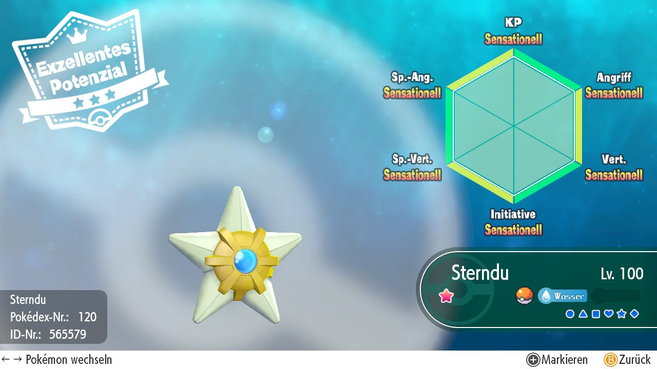 Das Pokemon ist mit beeindruckenden 6×31 IV-Werten ausgestattet. Das bedeutet, dass es auf allen sechs Werten (KP, Ang., Sp-Ang., Vert., Sp-Vert., Init.) die maximalen 31 IV/DV-Punkte besitzt. Dein Pokemon startet somit mit herausragender Stärke in digitale Kämpfe.