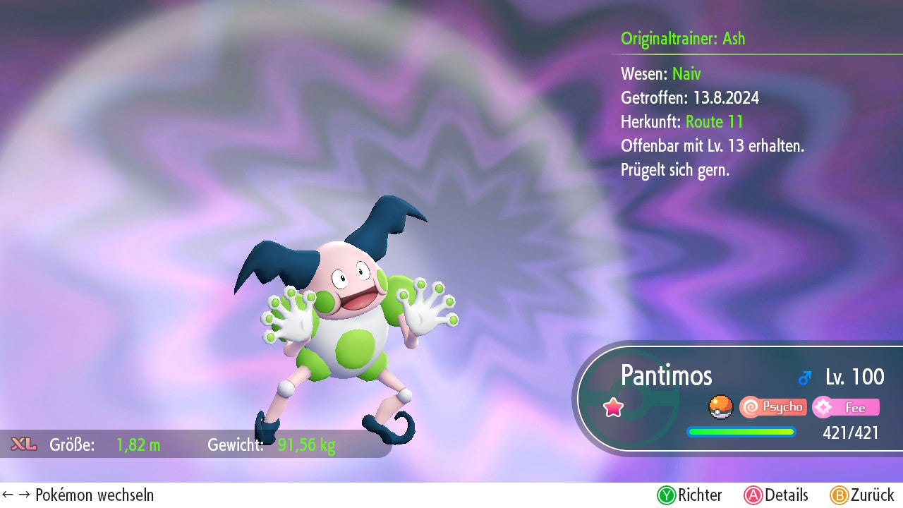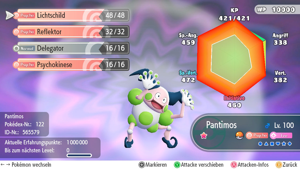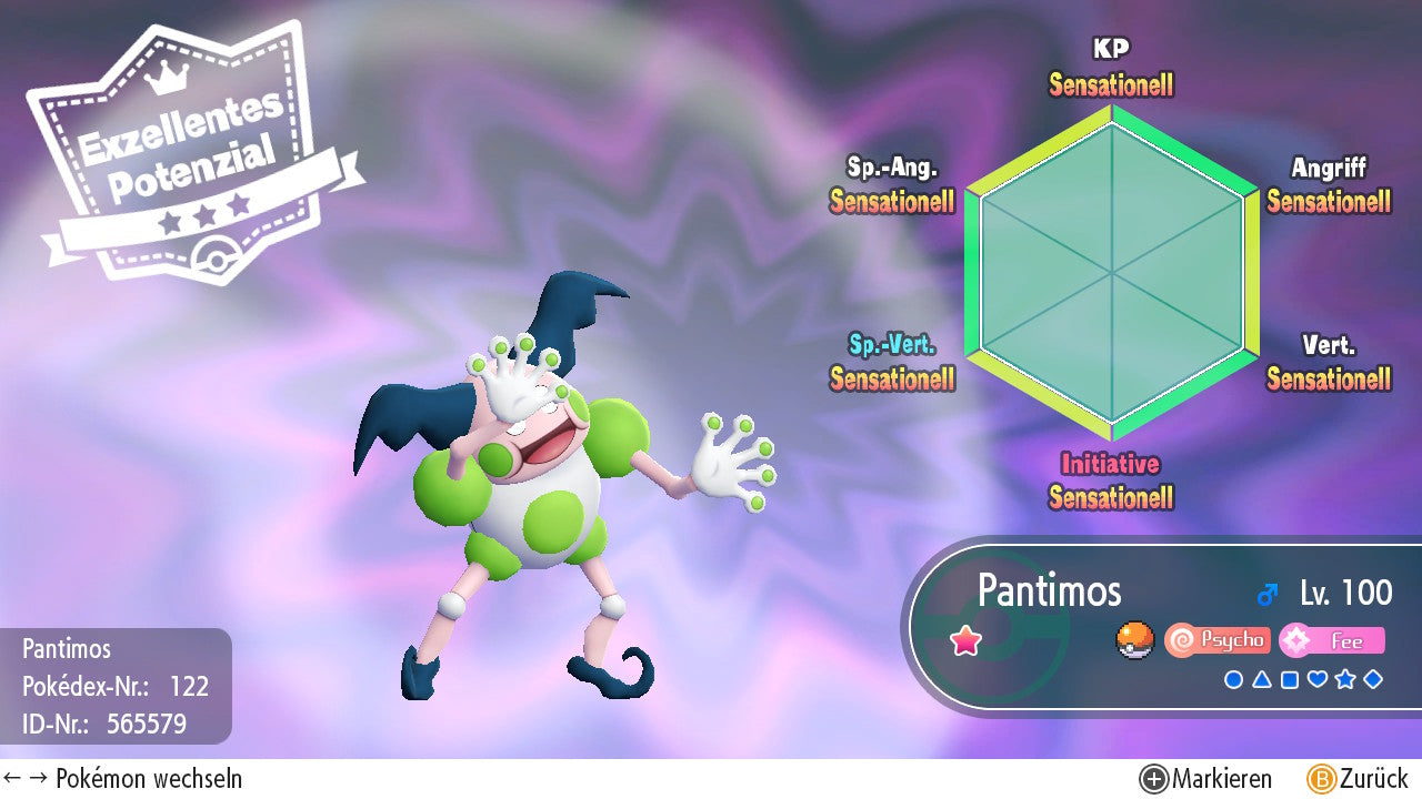 Das Pokemon ist mit beeindruckenden 6×31 IV-Werten ausgestattet. Das bedeutet, dass es auf allen sechs Werten (KP, Ang., Sp-Ang., Vert., Sp-Vert., Init.) die maximalen 31 IV/DV-Punkte besitzt. Dein Pokemon startet somit mit herausragender Stärke in digitale Kämpfe.