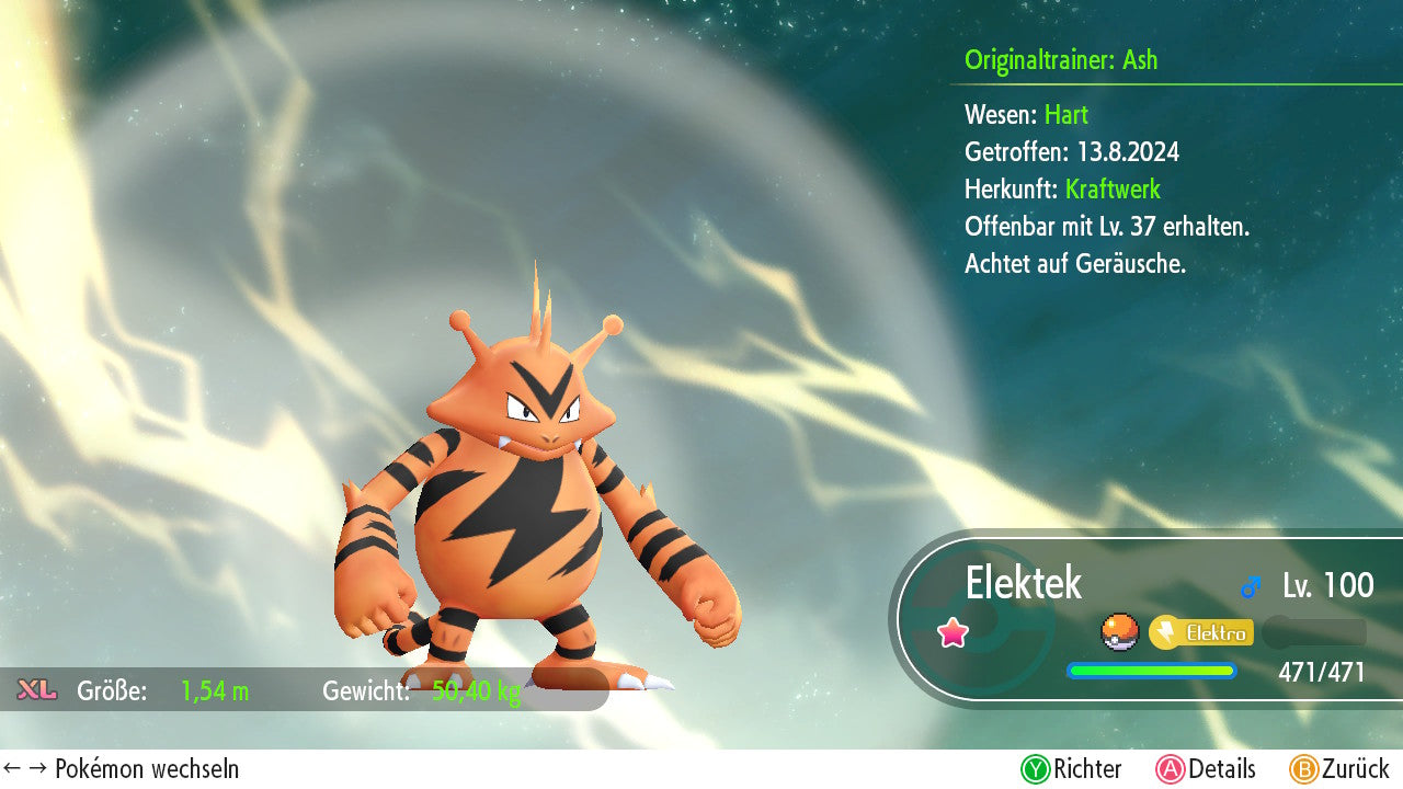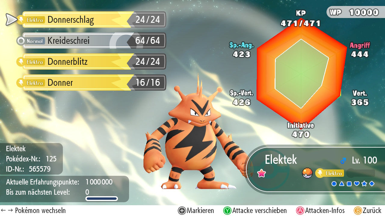 Das Pokemon ist mit beeindruckenden 6×31 IV-Werten ausgestattet. Das bedeutet, dass es auf allen sechs Werten (KP, Ang., Sp-Ang., Vert., Sp-Vert., Init.) die maximalen 31 IV/DV-Punkte besitzt. Dein Pokemon startet somit mit herausragender Stärke in digitale Kämpfe.