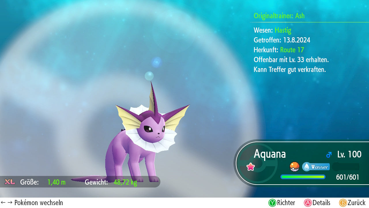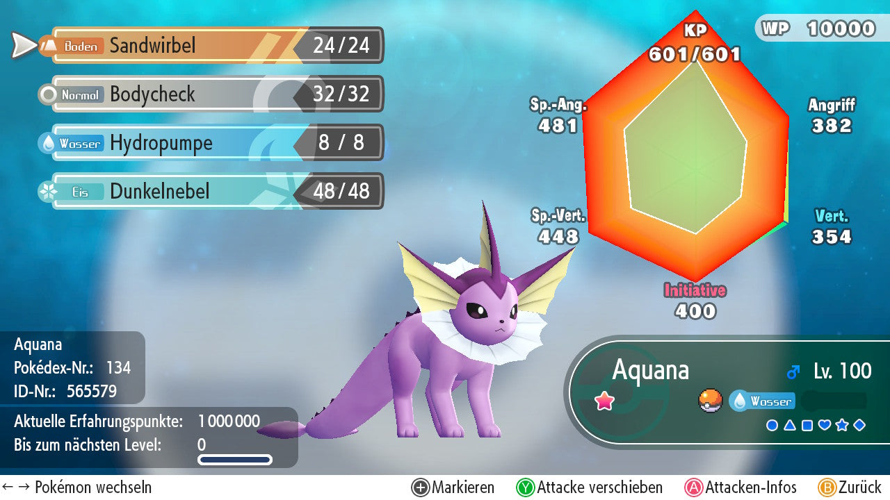 Das Pokemon ist mit beeindruckenden 6×31 IV-Werten ausgestattet. Das bedeutet, dass es auf allen sechs Werten (KP, Ang., Sp-Ang., Vert., Sp-Vert., Init.) die maximalen 31 IV/DV-Punkte besitzt. Dein Pokemon startet somit mit herausragender Stärke in digitale Kämpfe.