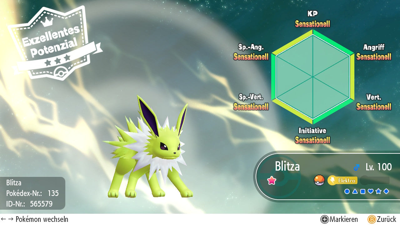 Das Pokemon ist mit beeindruckenden 6×31 IV-Werten ausgestattet. Das bedeutet, dass es auf allen sechs Werten (KP, Ang., Sp-Ang., Vert., Sp-Vert., Init.) die maximalen 31 IV/DV-Punkte besitzt. Dein Pokemon startet somit mit herausragender Stärke in digitale Kämpfe.