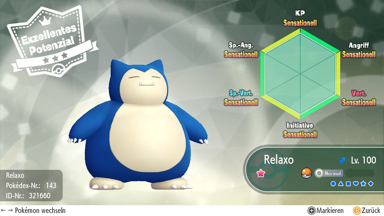 Das Pokemon ist mit beeindruckenden 6×31 IV-Werten ausgestattet. Das bedeutet, dass es auf allen sechs Werten (KP, Ang., Sp-Ang., Vert., Sp-Vert., Init.) die maximalen 31 IV/DV-Punkte besitzt. Dein Pokemon startet somit mit herausragender Stärke in digitale Kämpfe.