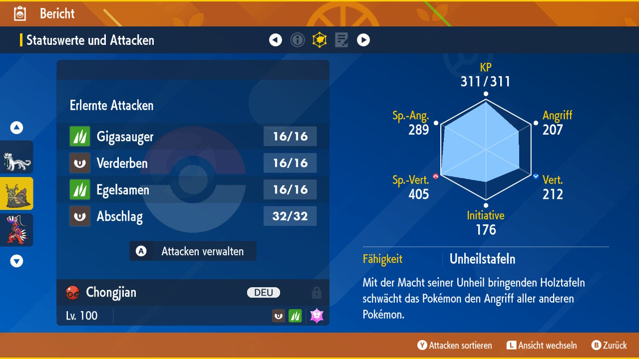 Das Pokemon ist mit beeindruckenden 6×31 IV-Werten ausgestattet. Das bedeutet, dass es auf allen sechs Werten (KP, Ang., Sp-Ang., Vert., Sp-Vert., Init.) die maximalen 31 IV/DV-Punkte besitzt. Dein Pokemon startet somit mit herausragender Stärke in digitale Kämpfe.