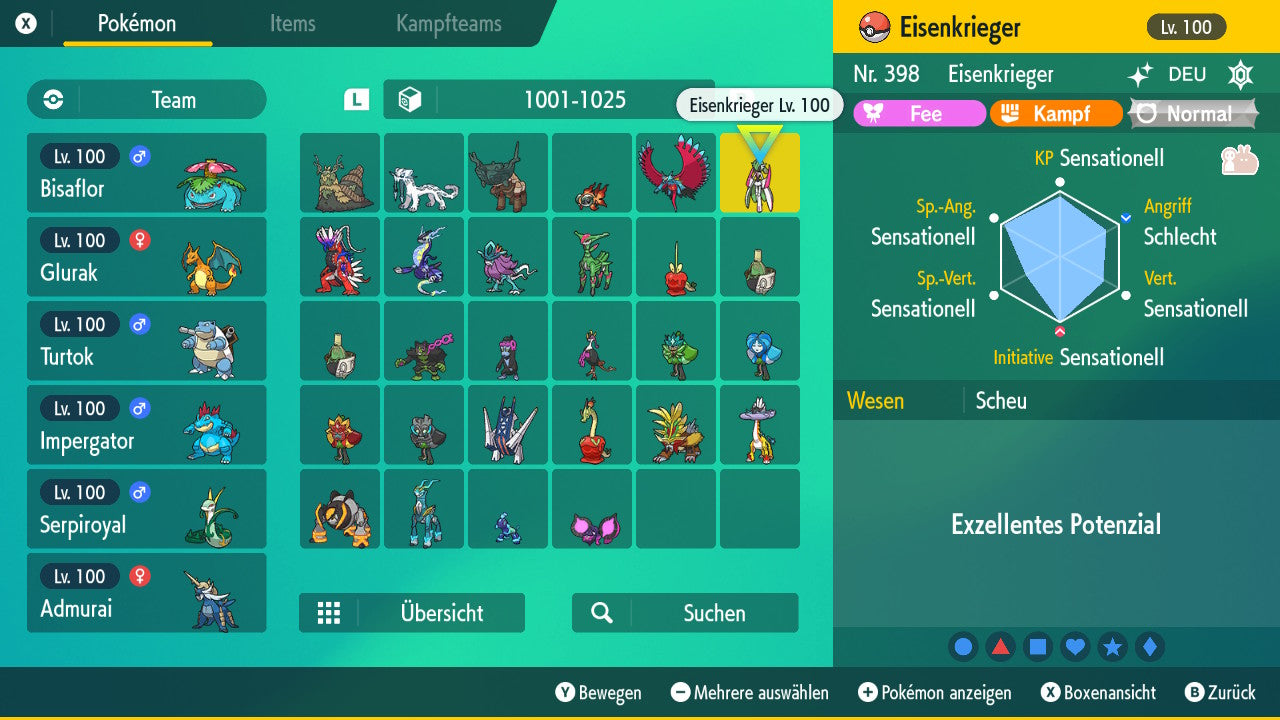 Das Pokemon ist mit beeindruckenden 6×31 IV-Werten ausgestattet. Das bedeutet, dass es auf allen sechs Werten (KP, Ang., Sp-Ang., Vert., Sp-Vert., Init.) die maximalen 31 IV/DV-Punkte besitzt. Dein Pokemon startet somit mit herausragender Stärke in digitale Kämpfe.