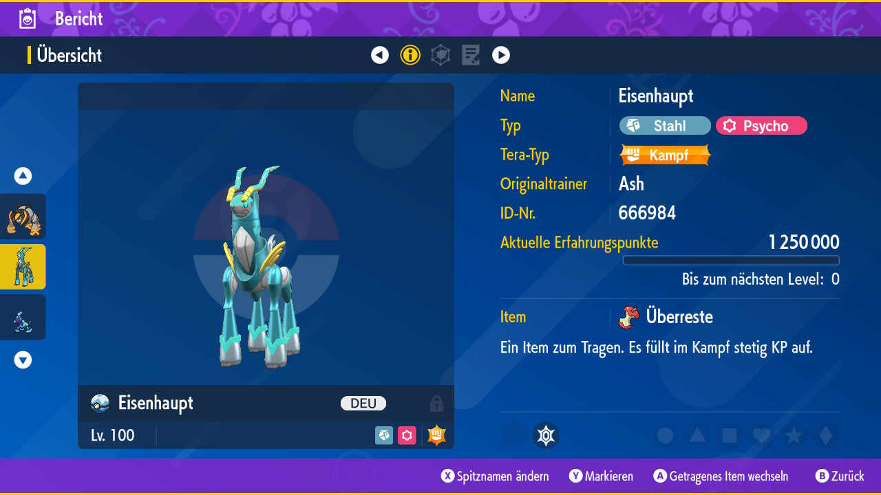 Das Pokemon ist mit beeindruckenden 6×31 IV-Werten ausgestattet. Das bedeutet, dass es auf allen sechs Werten (KP, Ang., Sp-Ang., Vert., Sp-Vert., Init.) die maximalen 31 IV/DV-Punkte besitzt. Dein Pokemon startet somit mit herausragender Stärke in digitale Kämpfe.