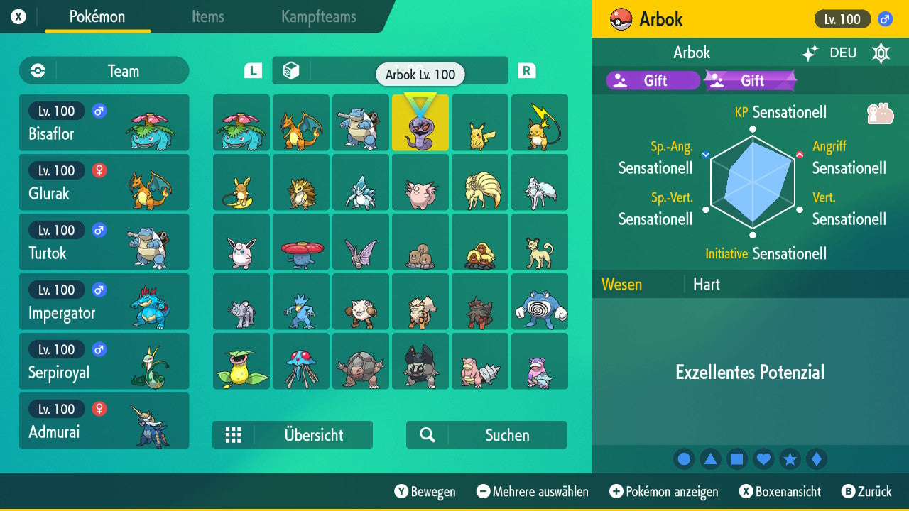 Das Pokemon ist mit beeindruckenden 6×31 IV-Werten ausgestattet. Das bedeutet, dass es auf allen sechs Werten (KP, Ang., Sp-Ang., Vert., Sp-Vert., Init.) die maximalen 31 IV/DV-Punkte besitzt. Dein Pokemon startet somit mit herausragender Stärke in digitale Kämpfe.