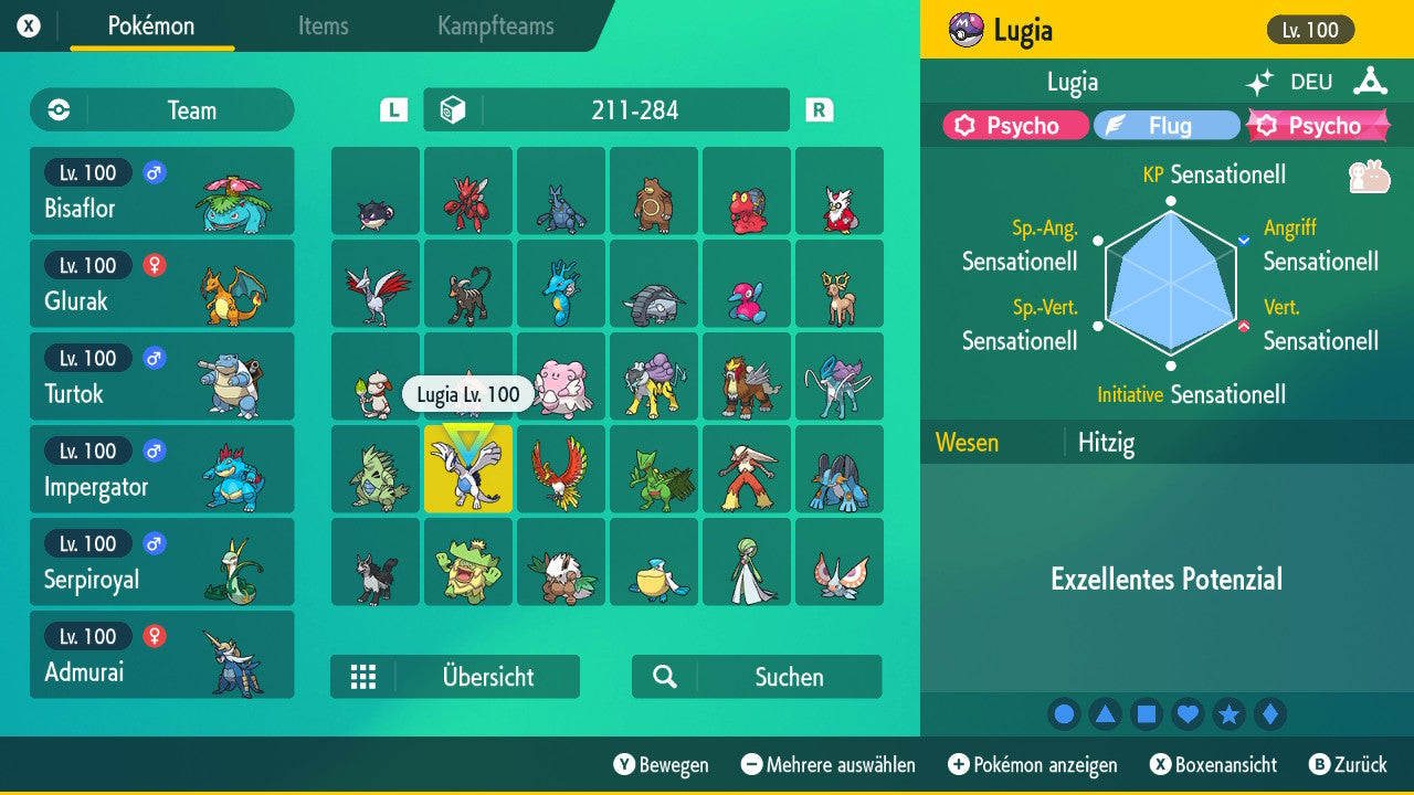 Das Pokemon ist mit beeindruckenden 6×31 IV-Werten ausgestattet. Das bedeutet, dass es auf allen sechs Werten (KP, Ang., Sp-Ang., Vert., Sp-Vert., Init.) die maximalen 31 IV/DV-Punkte besitzt. Dein Pokemon startet somit mit herausragender Stärke in digitale Kämpfe.